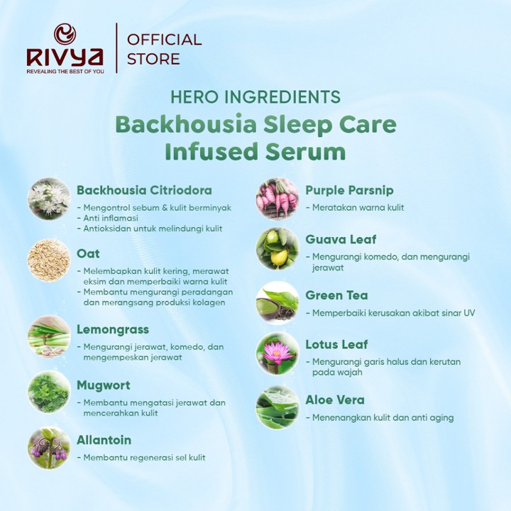 RIVYA Backhousia Sleep Care Infused Serum adalah pelembab wajah super rich yang diformulasikan khusus untuk memperbaiki skin barrier dan mencerahkan kulit sensitif, aman digunakan oleh ibu hamil dan menyusui. Dengan rating 4.92 dari lebih 10.000 terjual, serum ini menjadi pilihan populer bagi mereka yang mencari solusi kulit halus, cerah, dan bebas beruntusan dengan tekstur yang nyaman.