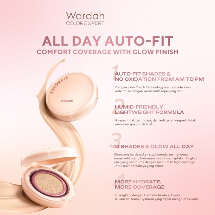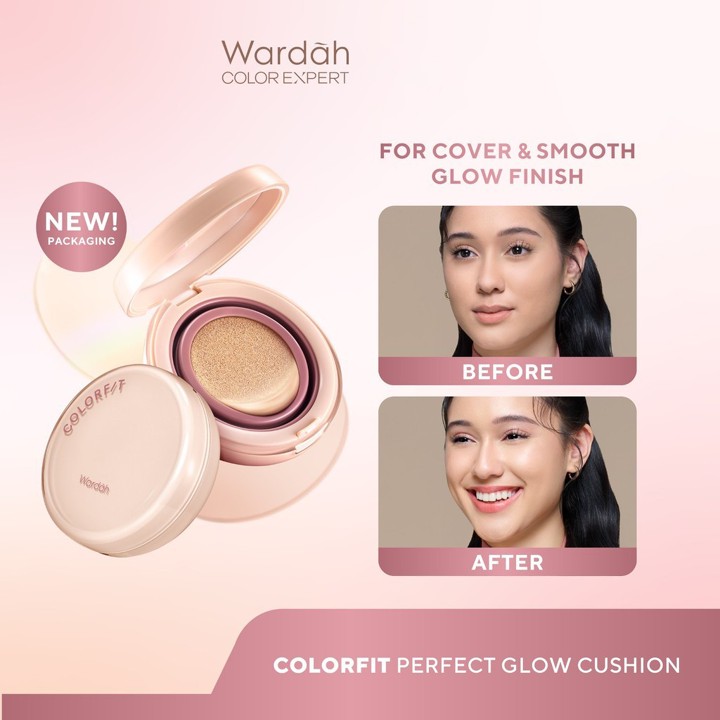 WARDAH Colorfit Perfect Glow Cushion menawarkan hasil makeup glowing dengan coverage medium hingga tinggi yang tahan hingga 12 jam, cocok untuk kulit normal hingga kering. Dilengkapi SPF 40 PA+++ dan kandungan CICA, produk ini memberikan perlindungan sekaligus kelembaban tanpa rasa berat di wajah.