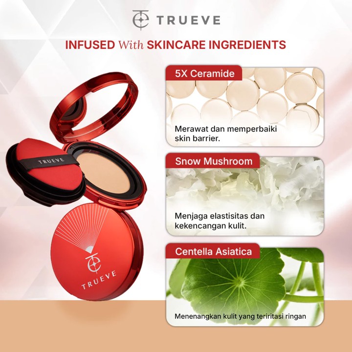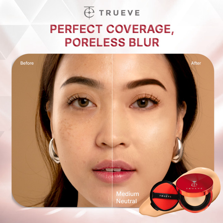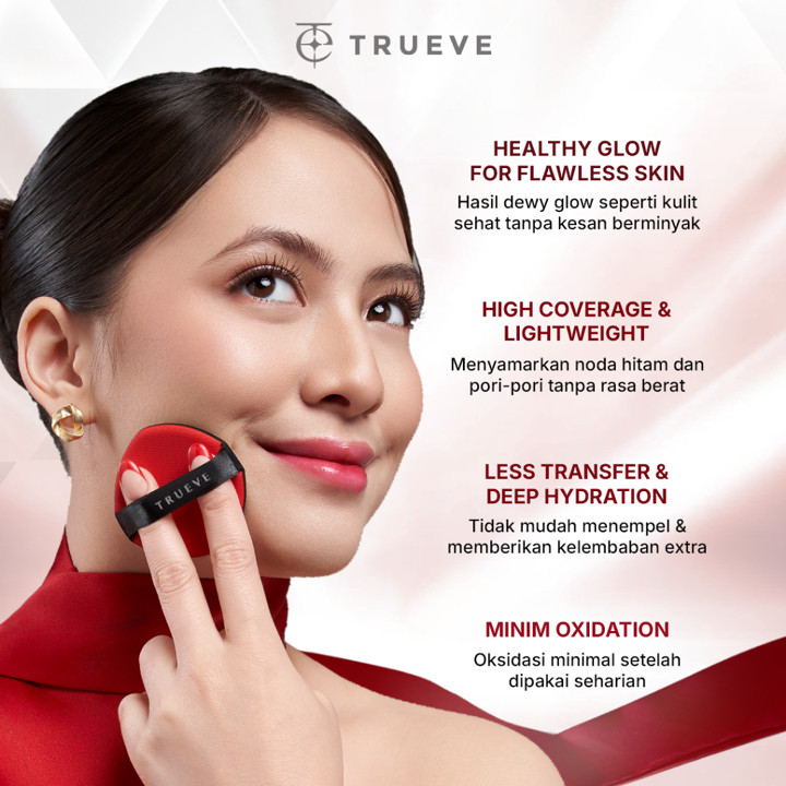 TRUEVE Radiant Hi-Cover Mesh Cushion menawarkan hasil akhir *flawless* dengan cakupan tinggi namun tetap memberikan tampilan kulit bercahaya (*radiant dewy glow*). Diformulasikan untuk memberikan hidrasi mendalam sekaligus menutupi ketidaksempurnaan kulit secara tahan lama. Ideal untuk riasan sehari-hari yang membutuhkan *coverage* maksimal tanpa terlihat berat.