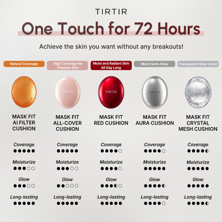TIRTIR Mask Fit AI Filter Cushion menawarkan tampilan kulit flawless dengan efek filter AI menggunakan teknologi ThinTechβ’ yang ringan dan tahan hingga 72 jam. Produk ini sangat cocok bagi Anda yang memiliki kulit berminyak hingga kombinasi dan menginginkan coverage tinggi dengan finish natural yang tidak berat.