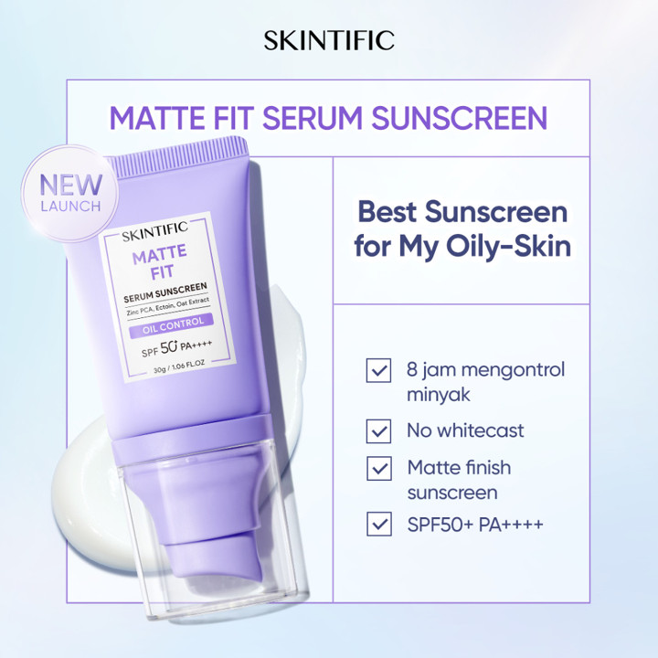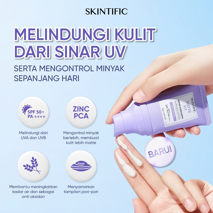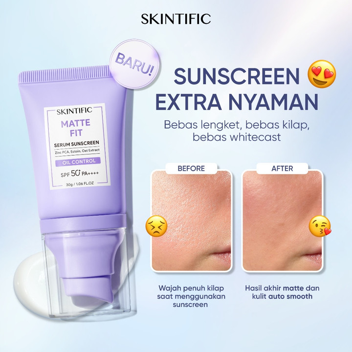 SKINTIFIC Matte Fit Serum Sunscreen SPF50+ PA++++ adalah pelindung sinar matahari all-in-one dengan teknologi anti UV dan kontrol minyak yang tahan hingga 12 jam. Produk ini menawarkan finishing matte yang menyamarkan pori-pori sekaligus berfungsi sebagai base makeup ringan tanpa perlu bedak tambahan.