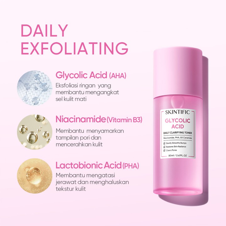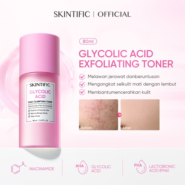SKINTIFIC Glycolic Acid Toner adalah solusi eksfoliasi harian yang menggabungkan kekuatan AHA dengan Niacinamide dan Ceramides untuk mencerahkan kulit dan memperbaiki skin barrier. Dengan harga terjangkau dan volume 80ml, produk ini sangat cocok untuk pemula yang ingin memulai rutinitas perawatan jerawat dan hiperpigmentasi dengan aman.
