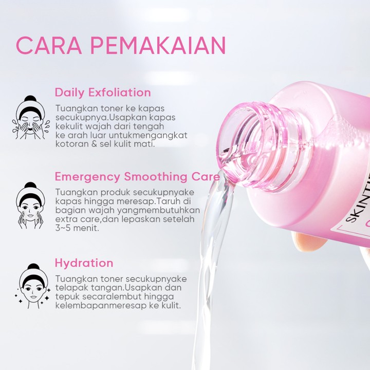 Teksturnya berbentuk cair yang ringan, menyerap dengan cepat tanpa meninggalkan rasa lengket, menjadikannya mudah diaplikasikan sebagai toner atau serum di pagi dan malam hari. Toner ini dirancang aman untuk berbagai jenis kulit termasuk kulit berminyak, normal, hingga sensitif yang berjerawat, dengan instruksi penggunaan dua kali sehari untuk hasil maksimal dalam memperbaiki tekstur wajah dan keseragaman warna kulit.