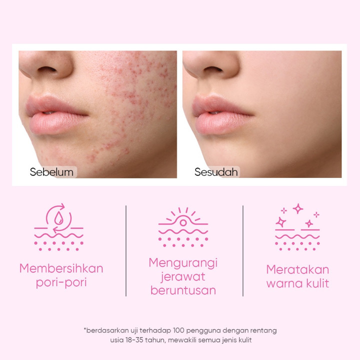 Produk ini diformulasikan dengan kombinasi Glycolic Acid sebagai eksfoliator utama untuk mengangkat sel kulit mati dan melawan jerawat, didukung oleh Niacinamide dan Lactobionic Acid yang bekerja sinergis untuk mengurangi tampilan pori-pori dan mencerahkan noda hitam. Kehadiran 5X Ceramides menjadi nilai tambah unik yang memastikan proses pengelupasan tidak merusak skin barrier, sehingga kulit tetap terjaga kelembabannya dan tampak lebih halus serta bercahaya setelah penggunaan rutin.