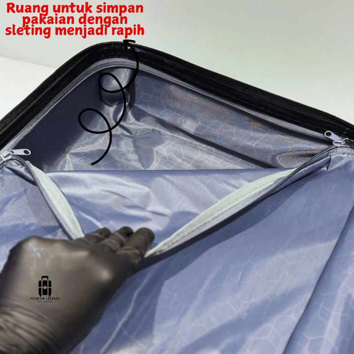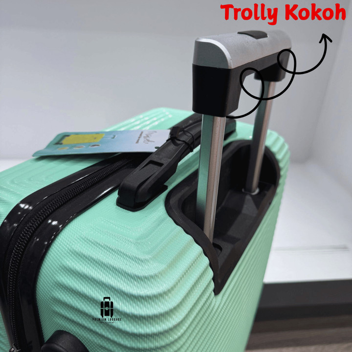 Material utama menggunakan Fiber ABS yang diklaim memiliki kualitas tinggi namun tetap ringan dengan berat kosong sekitar 2 kg. Cangkang yang kokoh mampu menahan beban hingga 16 kg, sementara bagian dalam dilapisi kain satin untuk mencegah gesekan pakaian. Roda trolley berbahan stainless steel dengan panjang 34 cm menjamin ketahanan terhadap benturan dan keausan selama penggunaan jangka panjang.