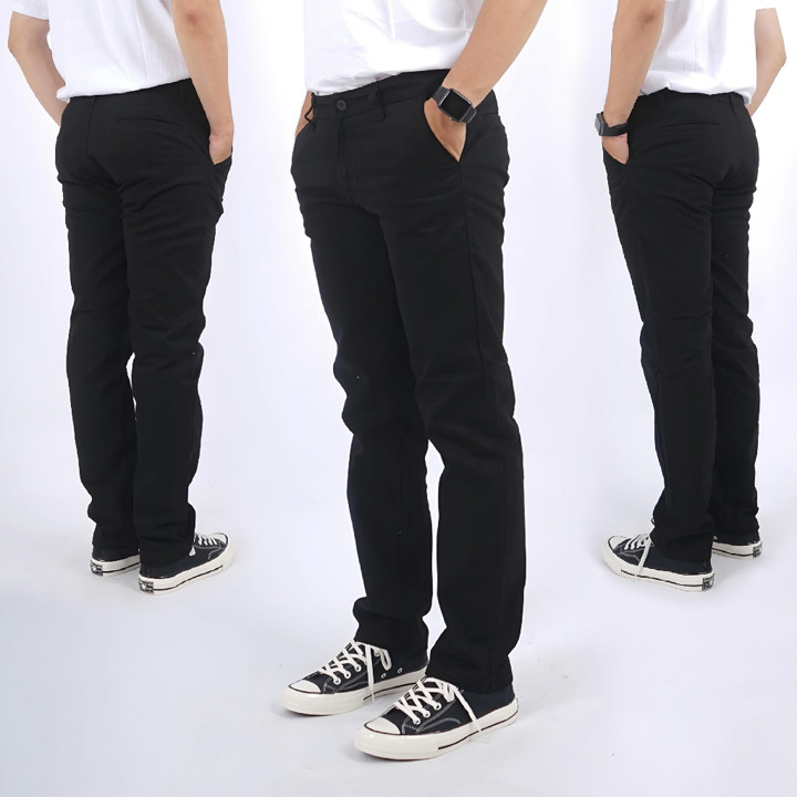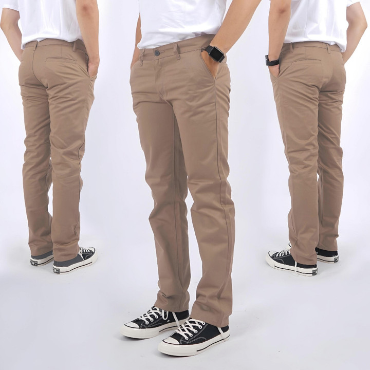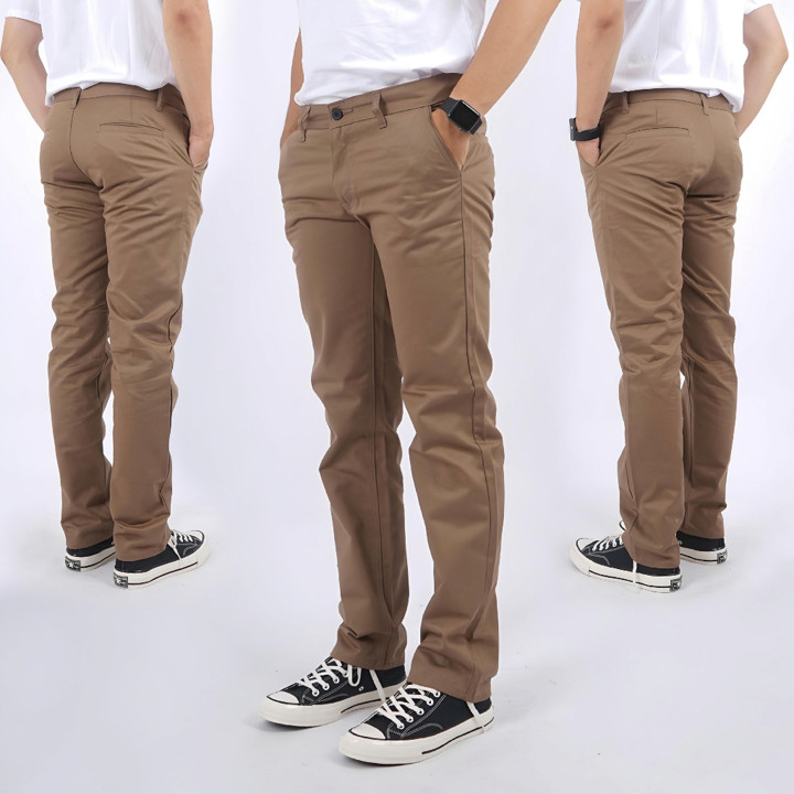 Desainnya mengusung gaya Reguler Fit dengan potongan modern yang pas di pinggang (Mid Waist), cocok untuk gaya atletis, basic, maupun kasual. Tersedia dalam berbagai warna seperti khaki, mocca, coksu, dan abu tua, serta mencakup ukuran jumbo untuk variasi tubuh yang lebih besar. Model saku belakang menggunakan desain paspol yang rapi, dengan opsi kustomisasi saku tempel jika diperlukan.