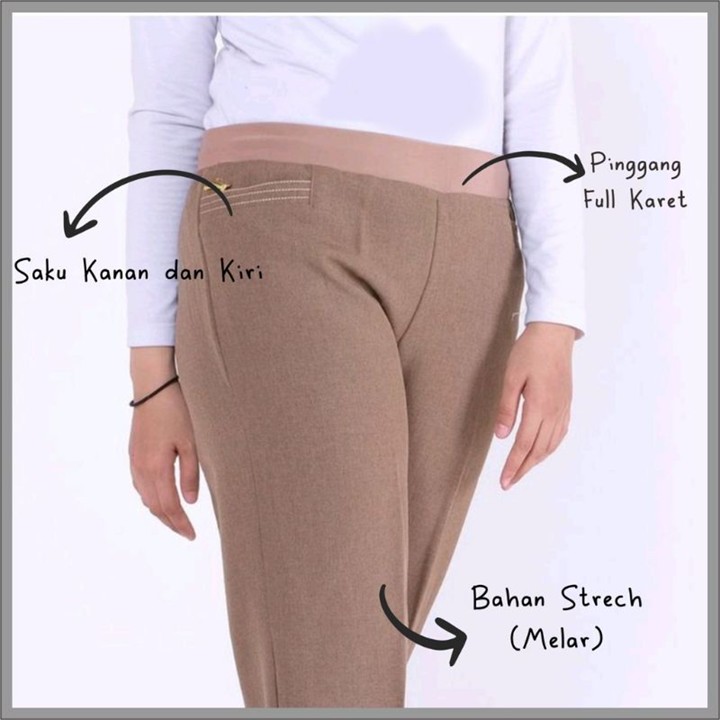 Wanita pekerja kantoran atau ibu rumah tangga yang membutuhkan celana kerja nyaman, tahan lama, dan tersedia dalam ukuran besar (plus size) dengan budget terbatas.