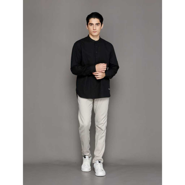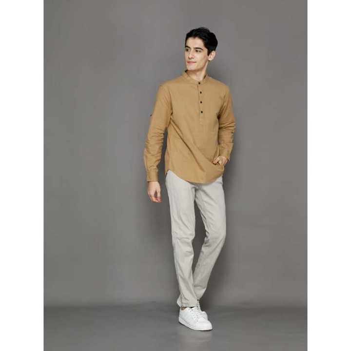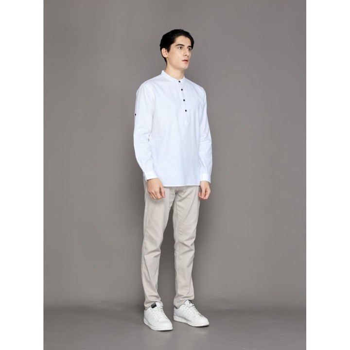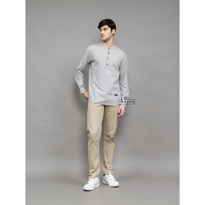Desain kemeja ini sangat adaptif; meskipun memiliki Kerah Mandarin yang memberikan sentuhan formal, sifat bahannya memungkinkan pemakaian dalam acara kasual. Dengan motif polos, kemeja ini mudah dipadupadankan. Adanya penyediaan detail size chart yang sangat lengkap menunjukkan perhatian produsen terhadap variasi bentuk tubuh pria Indonesia.