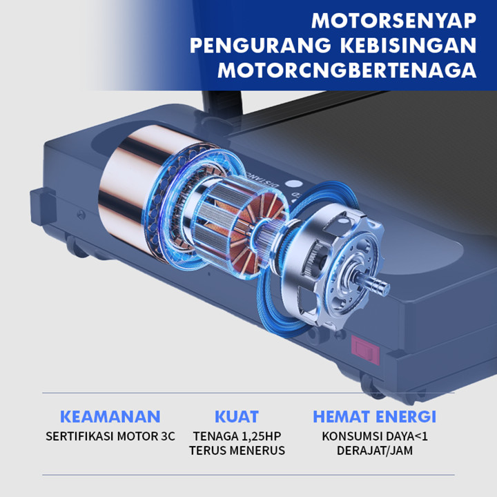 Treadmill ini menawarkan fitur unggulan berupa kemampuan dilipat untuk menghemat ruang penyimpanan, panel kontrol digital yang menampilkan kecepatan, kalori, jarak, dan waktu, serta sistem pendingin ultra-senyap yang meminimalkan gangguan lingkungan. Keunggulannya terletak pada integrasi remote control nirkabel yang memudahkan pengoperasian tanpa harus menyentuh panel utama, serta rentang kecepatan 1-10km/jam yang aman untuk jogging ringan sesuai rekomendasi keselamatan produsen dengan tenaga mesin 1.75HP hingga 3.0HP.