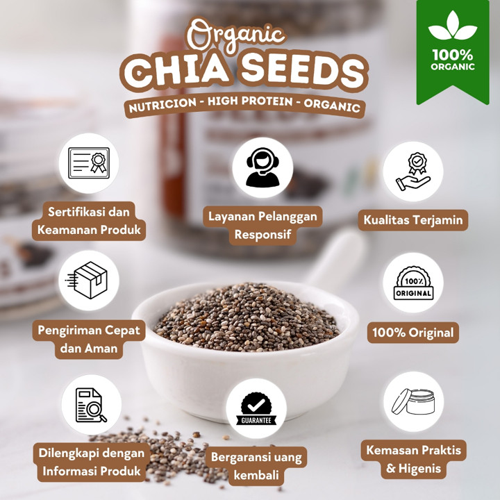 Kualitas utama produk ini terletak pada klaimnya sebagai Chia Seeds Organic Premium yang diposisikan sebagai sumber protein terlengkap. Fitur pendukung seperti sertifikasi BPOM, label Halal, dan jaminan Non-GMO memberikan kepercayaan tinggi bagi konsumen yang memperhatikan aspek kesehatan dan kehalalan. Kehadiran masa kedaluwarsa yang masih panjang (hingga 2027) juga menjadi nilai jual signifikan.