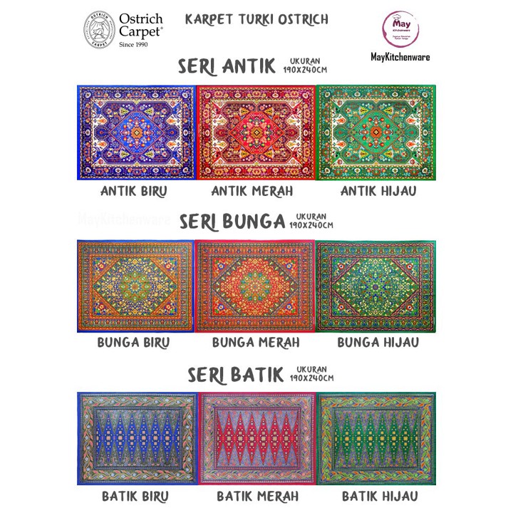 Karpet Ostrich Jazmine ini menawarkan solusi lantai dekoratif berkualitas ekspor dengan harga sangat terjangkau, tersedia dalam berbagai motif dan ukuran jumbo hingga standar. Dengan bobot ringan dan material non-woven yang tidak berbulu, produk ini ideal untuk mempercantik ruang keluarga atau kamar tidur dengan cepat.