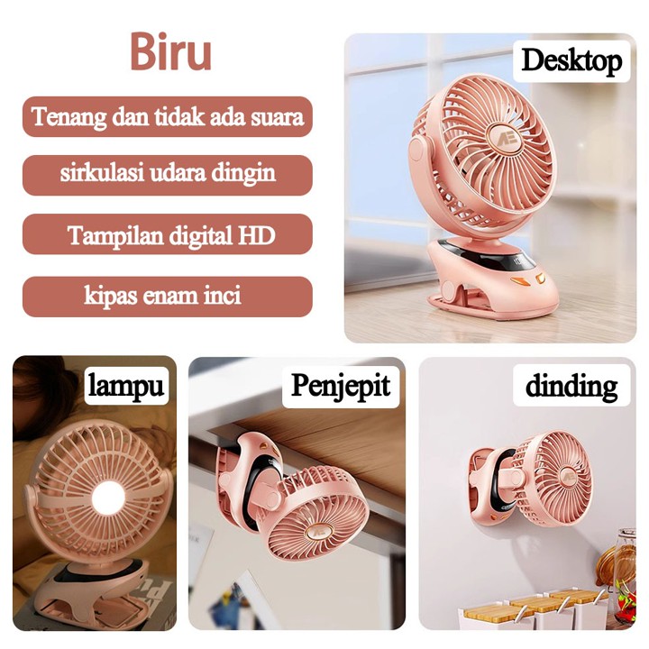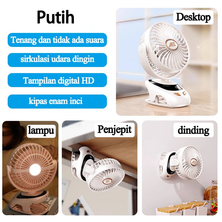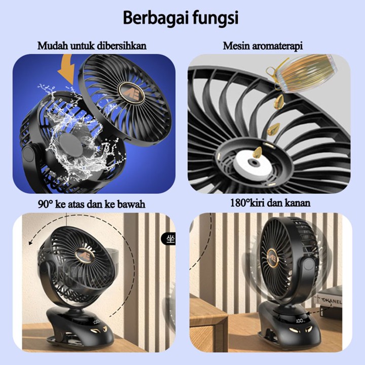 Produk ini menonjolkan fitur utama sebagai kipas angin mini yang sangat portabel, didukung oleh kapasitas baterai masif 30000mAh. Keunggulan fitur yang ditawarkan sangat komprehensif, mencakup fungsi pendinginan utama, kemampuan jepit meja, serta fitur tambahan seperti lampu LED dan diffuser aromaterapi. Keberagaman fitur ini menjadikannya lebih dari sekadar kipas angin biasa.
