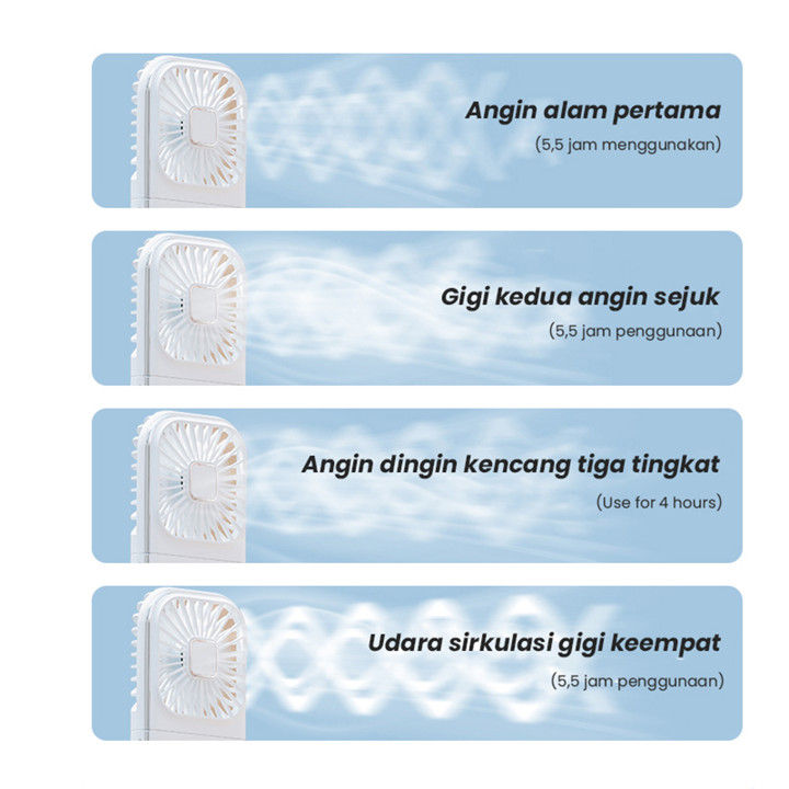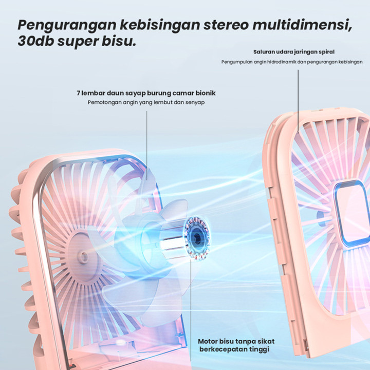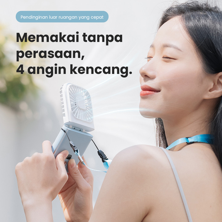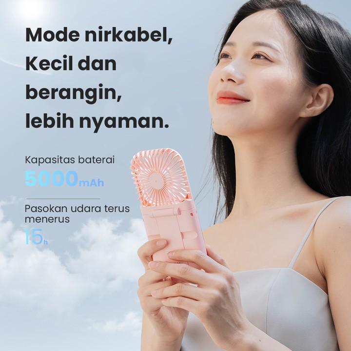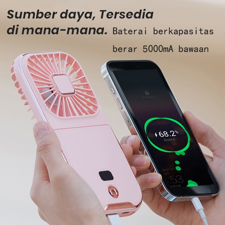 Produk ini menawarkan fitur unggulan berupa kipas angin portabel dengan kecepatan angin yang kencang namun tetap beroperasi tanpa suara bising, memberikan kenyamanan maksimal. Desainnya dilengkapi dengan mekanisme lipat yang praktis, fungsi sandaran ponsel untuk menonton konten sambil sejuk, serta indikator LED yang jelas untuk memantau sisa baterai dan kecepatan angin. Sebagai tambahan, unit ini terintegrasi dengan baterai 5000mAh yang berfungsi sebagai powerbank isi ulang via USB Type-C, memungkinkan pengguna mengisi daya perangkat lain saat baterai kipas menipis.