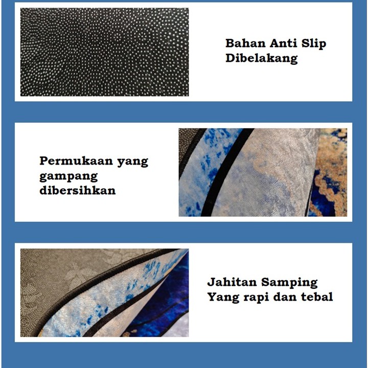 Desain:desain brg yg dtg beda dgn gbr yg dipesan, tone warna nya sama, motifnya beda..tp masih ok lah.. ukuran 150 x 100 cm Tekstur:halus, tp bukan karpet, spt kain tebal halus yg diatasnya di print motif karpet, dan bagian bawahnya dilapis kain anti slip.. Kegunaan:alhamdulillah masih bisa dipake buat alas duduk ..buat sajadah juga ok