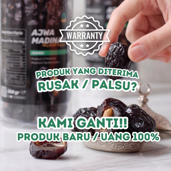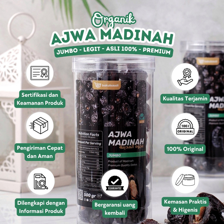 Kualitas produk ini sangat teruji dengan sertifikasi Halal dan klaim originalitas 100% Kurma Ajwa Madinah Grade 1. Kurma ini memiliki ukuran jumbo yang konsisten dengan daging tebal, tekstur lembut, dan rasa manis legit yang tidak kering. Produk telah melalui proses penyortiran dan pembersihan ketat untuk memastikan kebersihan, serta dikemas dengan kemasan higienis yang kuat untuk menjaga kualitas selama pengiriman.