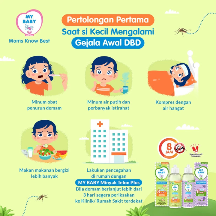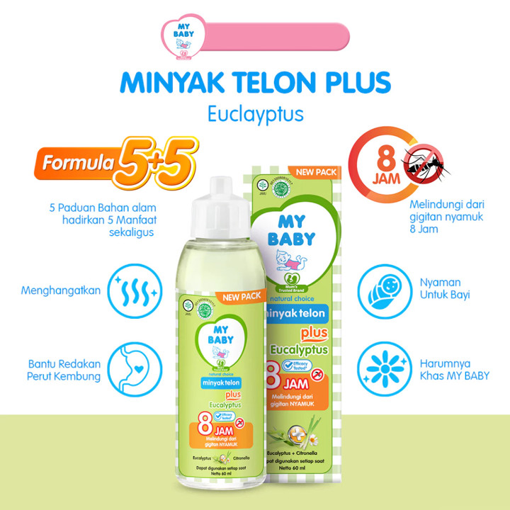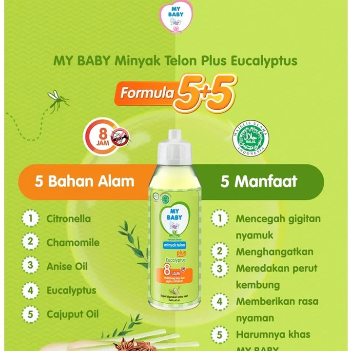 MY BABY Minyak Telon Plus Eucalyptus adalah solusi perawatan bayi multifungsi yang menggabungkan kehangatan tradisional dengan perlindungan anti-nyamuk hingga 8 jam. Produk ini diformulasikan dari bahan alami seperti Eucalyptus dan Citronella yang aman, halal, dan terdaftar BPOM untuk kenyamanan si kecil.