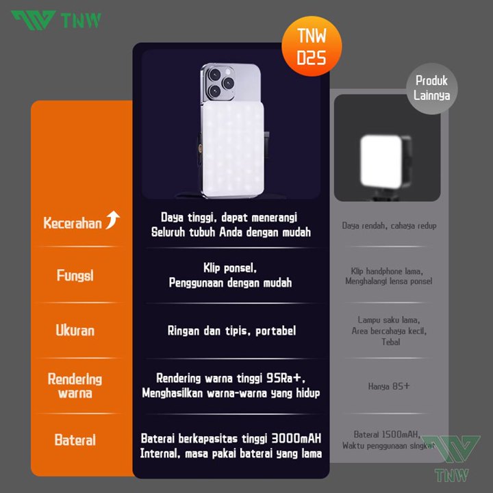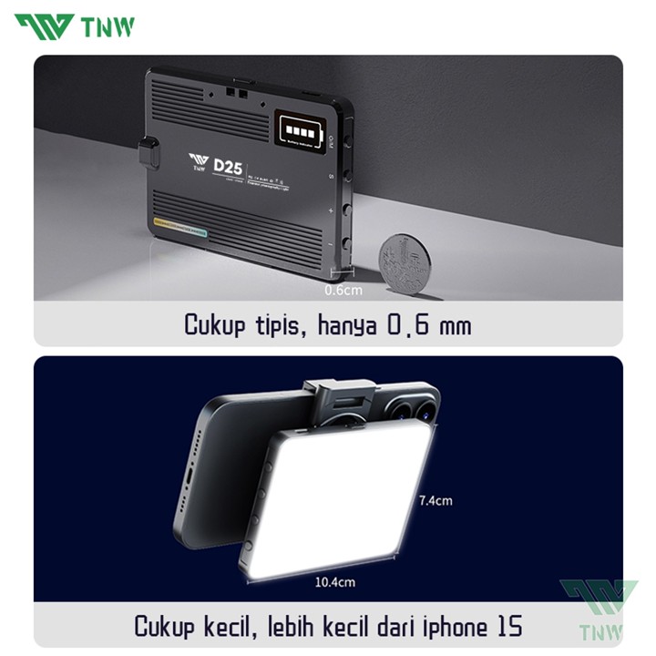 Lampu selfie portable TNW D25 ini adalah solusi pencahayaan serbaguna dengan 72 LED beads dan fitur penyesuaian warna serta kecerahan yang sangat detail. Ideal untuk konten kreator, meeting online, hingga kebutuhan penerangan darurat karena desainnya yang <strong >compact</strong> dan mudah dibawa ke mana saja.
