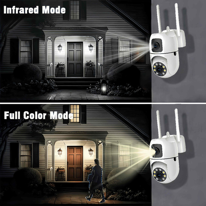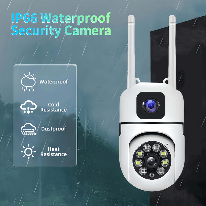 Kamera CCTV dual lens PTZ outdoor nirkabel ini menawarkan pemantauan panorama 360 derajat dengan dua lensa 5MP, ideal untuk kebutuhan keamanan rumah atau bisnis kecil. Dengan fitur nirkabel, penglihatan malam inframerah, dan dukungan aplikasi, produk ini memberikan cakupan keamanan yang komprehensif dan mudah dipasang.