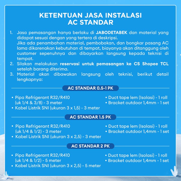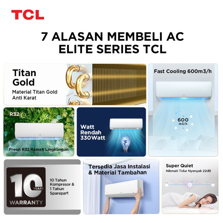 TCL AC TAC 05 CSD/XBS menawarkan solusi pendinginan hemat energi 0.5 PK dengan harga kompetitif di bawah 2,6 juta rupiah, cocok untuk ruangan kecil di area Jabodetabek. Produk ini dilengkapi fitur low watt dan garansi hingga 10 tahun, namun pembeli perlu memperhitungkan biaya tambahan material pemasangan secara terpisah.