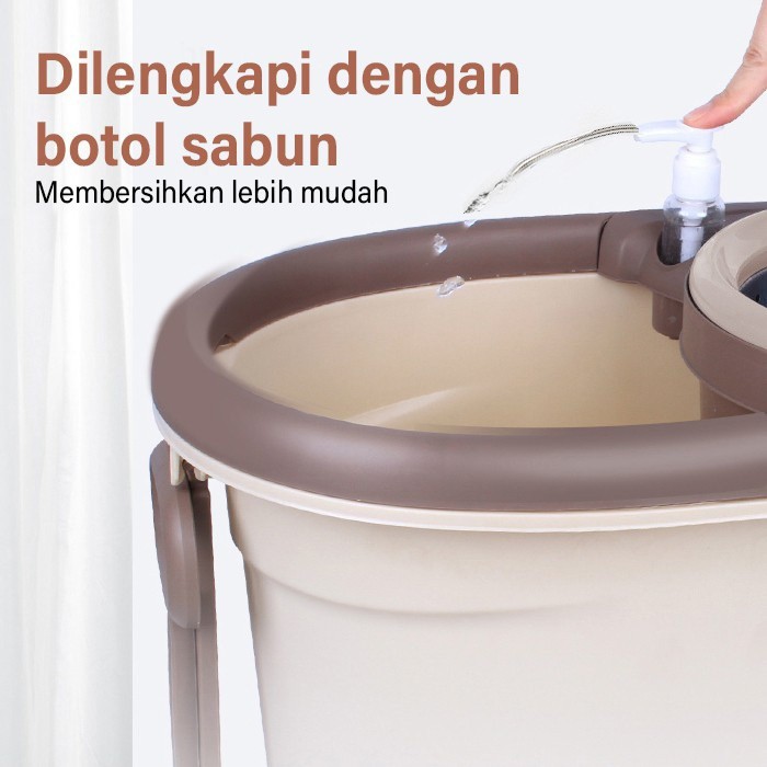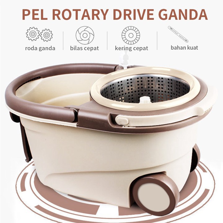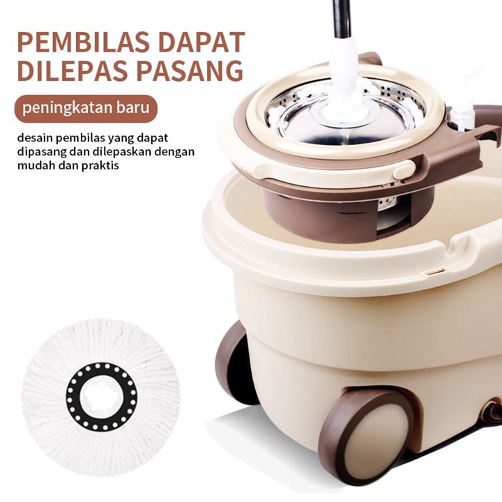 Alat pel ini dilengkapi dengan mekanisme perasan otomatis yang memungkinkan pengguna untuk menekan tombol dan langsung mendapatkan kain pel yang kering, menghilangkan kebutuhan untuk memeras secara manual yang melelahkan. Fitur kepala mop yang dapat berputar 360 derajat dirancang khusus untuk memastikan pembersihan yang merata di setiap sudut ruangan, sementara desain ergonomis pada pedal memudahkan pengguna, termasuk anak-anak atau lansia, untuk mengoperasikan alat ini dengan satu kaki.
