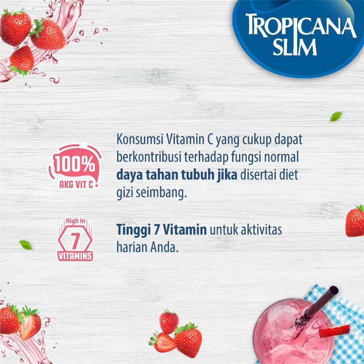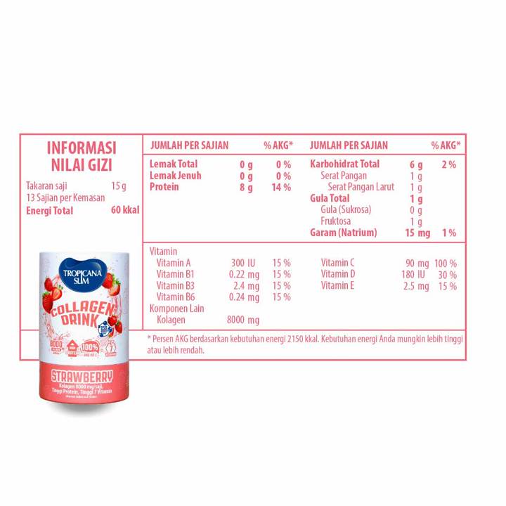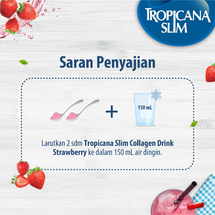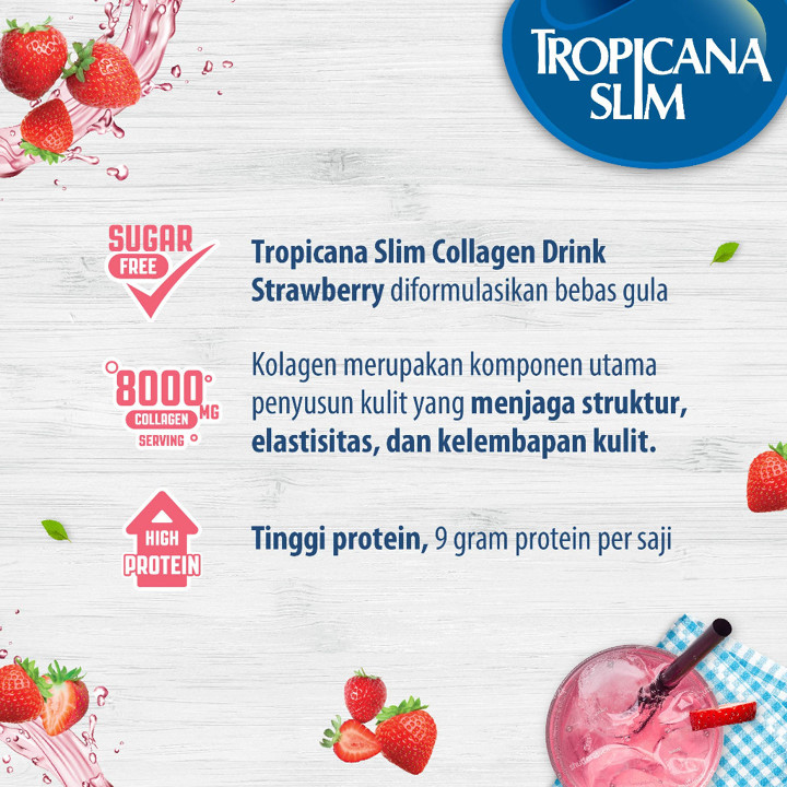Tropicana Slim Collagen Drink Srawberry adalah minuman kesehatan kulit berbasis kolagen dan glutathione tanpa gula yang dikemas dalam tabung praktis 200g. Produk ini menawarkan kombinasi rasa strawberry yang nikmat dengan klaim manfaat untuk kekenyalan kulit dan kesehatan tulang, didukung oleh rating tinggi 4.92 dari ribuan pembeli.