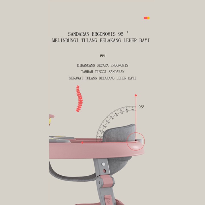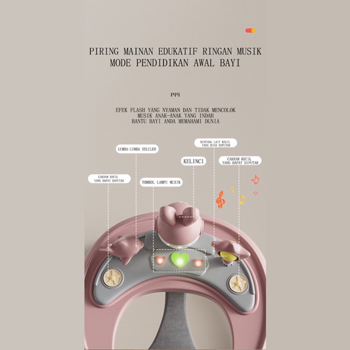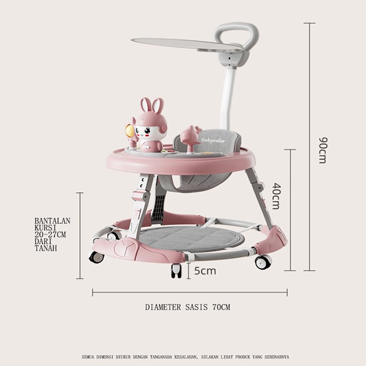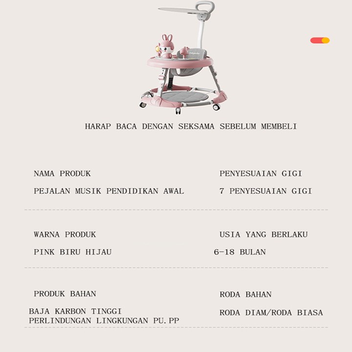 Produk ini dirancang sebagai alat bantu jalan yang dapat dilipat untuk kemudahan penyimpanan dan transportasi. Fitur utamanya meliputi roda yang memudahkan pergerakan, serta integrasi mainan musik dan boneka yang berfungsi sebagai stimulasi visual dan auditif bagi bayi. Namun, deskripsi produk secara eksplisit memperingatkan bahwa aksesori seperti sandaran tangan, atap, atau alas lantai hanya tersedia pada varian tertentu dan tidak otomatis disertakan pada semua pesanan.