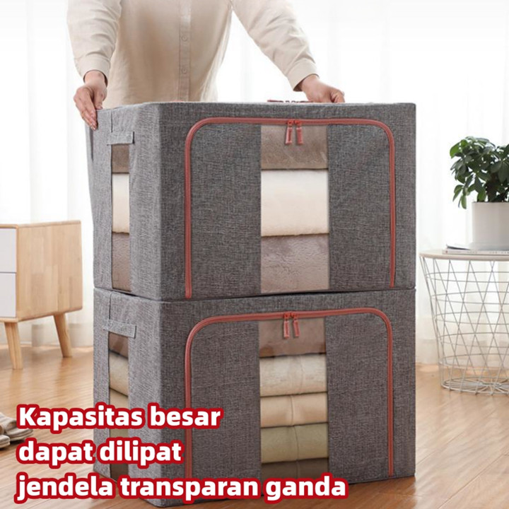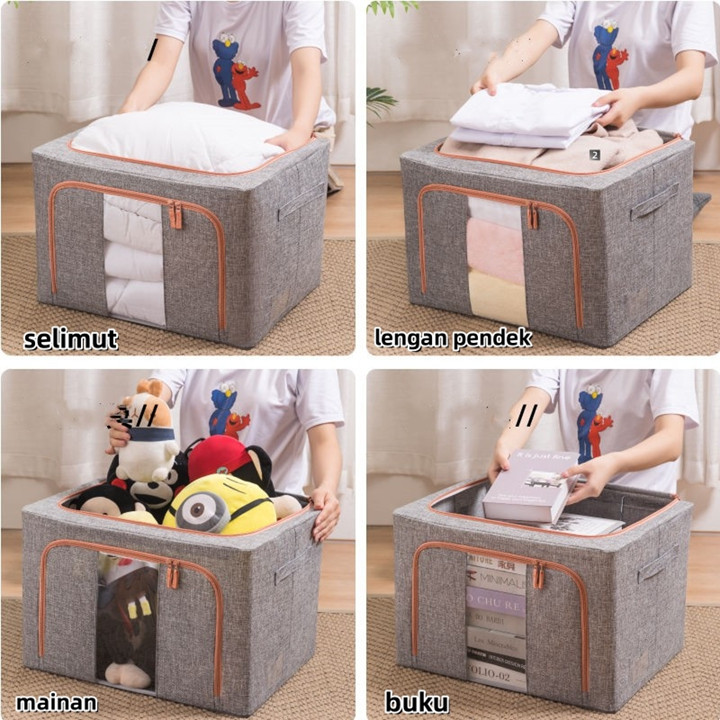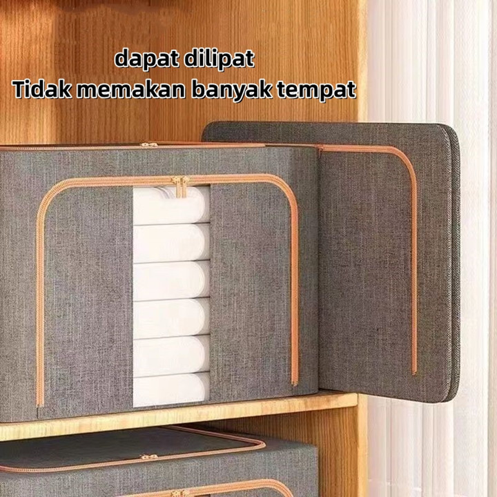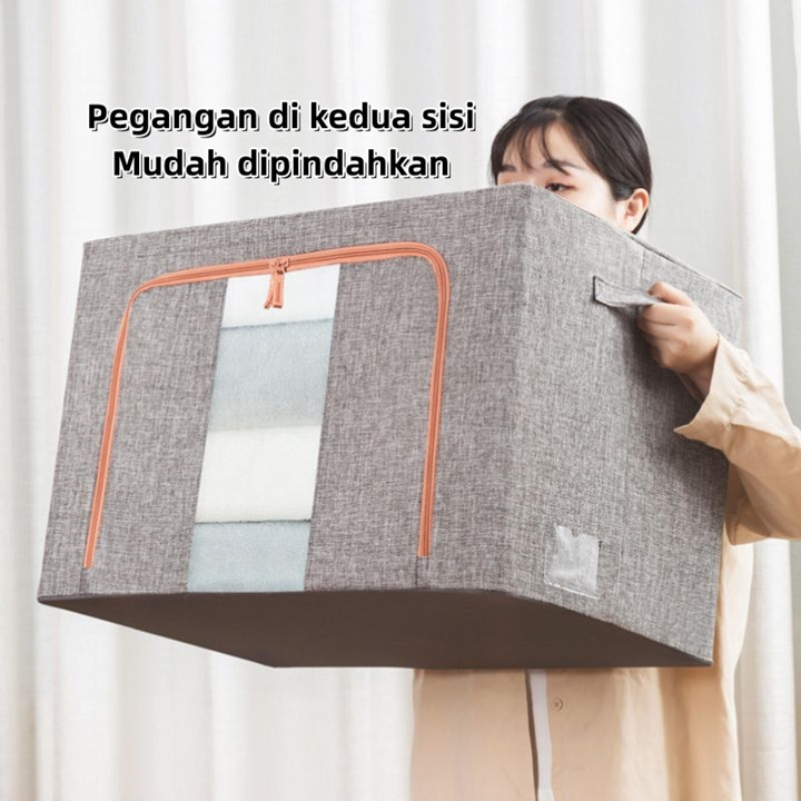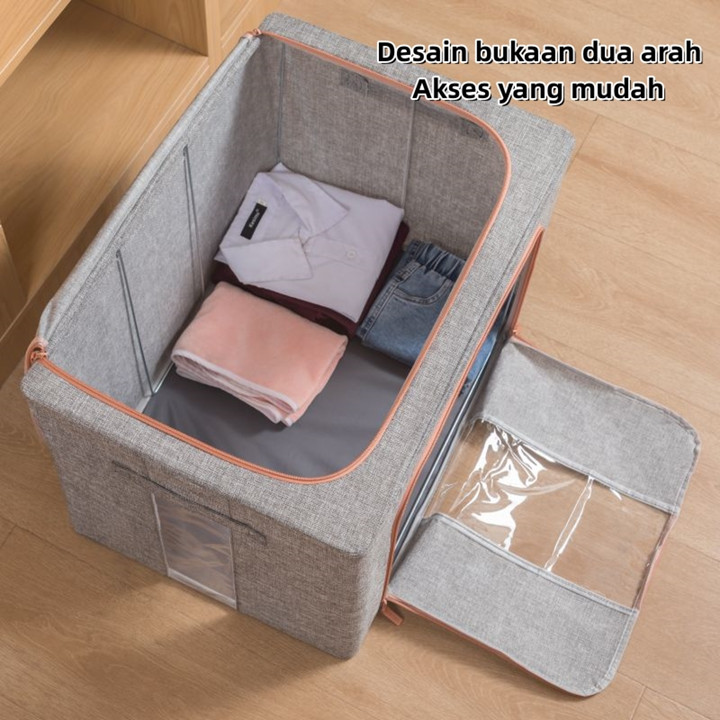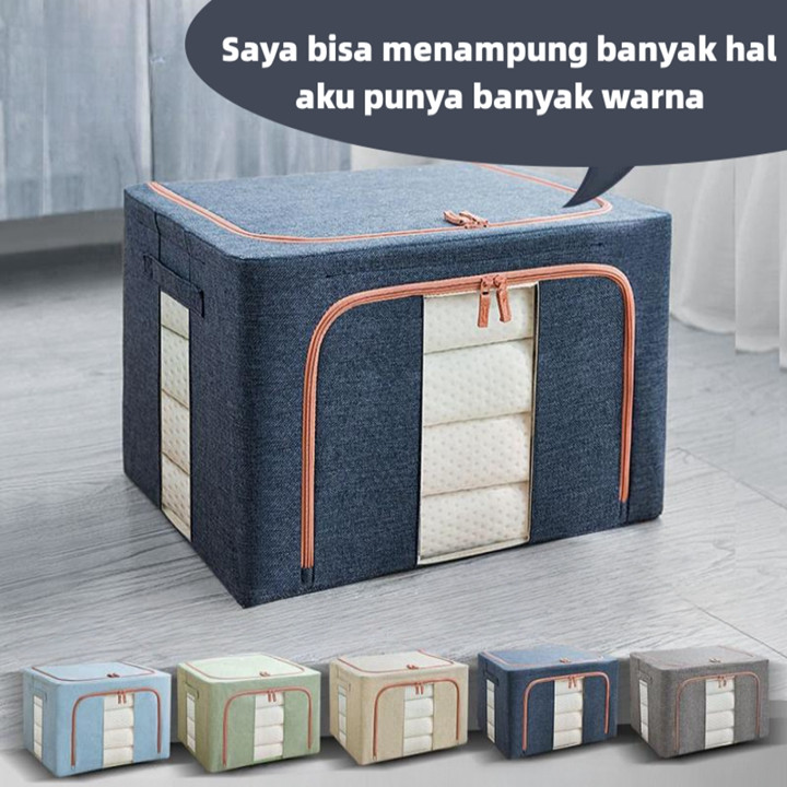 Produk ini dibuat dari bahan kain berkualitas tinggi dengan jahitan yang rapi dan kuat, didukung oleh rangka baja internal yang memberikan struktur kokoh meskipun bobotnya ringan. Fitur tahan air dan debu memastikan isi tetap aman dari kelembapan, menjadikannya pilihan praktis untuk menyimpan pakaian, mainan, atau barang rumah tangga lainnya.