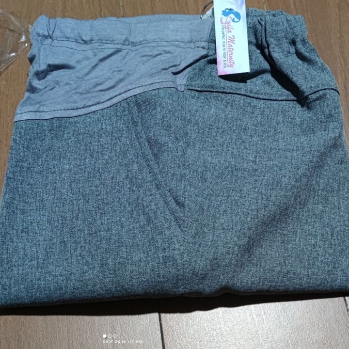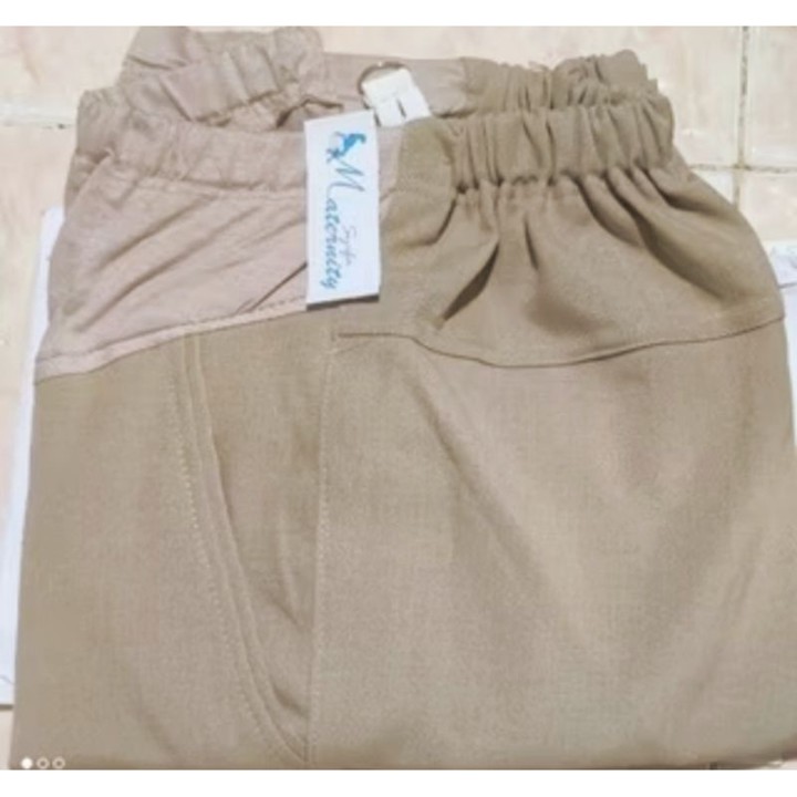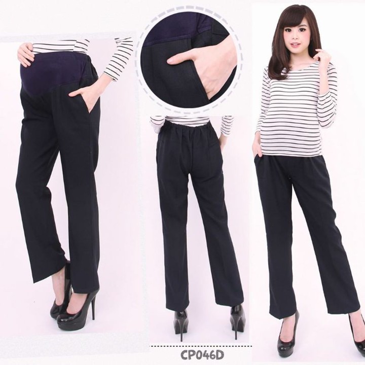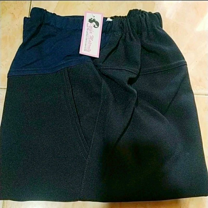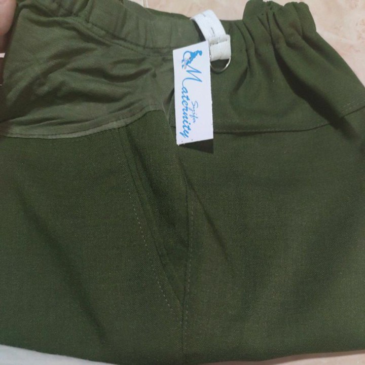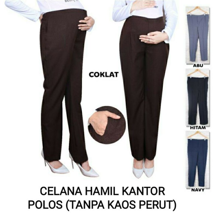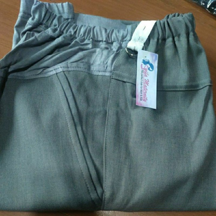 Bahan utama yang digunakan adalah kain kantor atau sejenis bahan jas, yang mengindikasikan fokus pada penampilan semi-formal. Konstruksi tambahan kaos di area perut sangat krusial karena memberikan fleksibilitas dan dukungan ekstra saat perut hamil membesar. Penggunaan karet berkancing pada pinggang adalah fitur konstruksi yang cerdas, memastikan kenyamanan maksimal sekaligus menjaga estetika pakaian agar tetap terlihat rapi dan terstruktur.