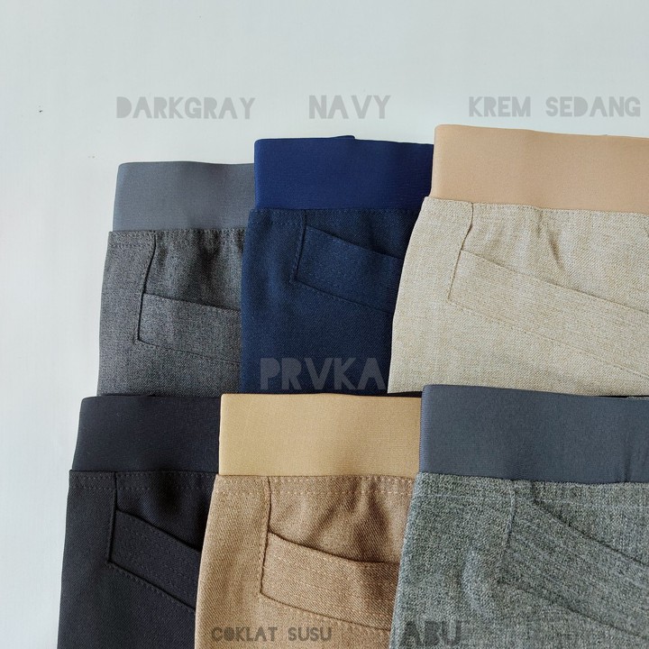 Secara desain, produk ini mengadopsi model celana kerja dengan fitur pinggang karet yang sangat memudahkan penyesuaian ukuran. Ketersediaan warna yang beragam (Hitam, Navy, Abu Muda, Darkgray, Krem Sedang) serta opsi pemesanan warna kustom meningkatkan fleksibilitas gaya, sangat mudah dipadukan dengan atasan formal maupun kasual.