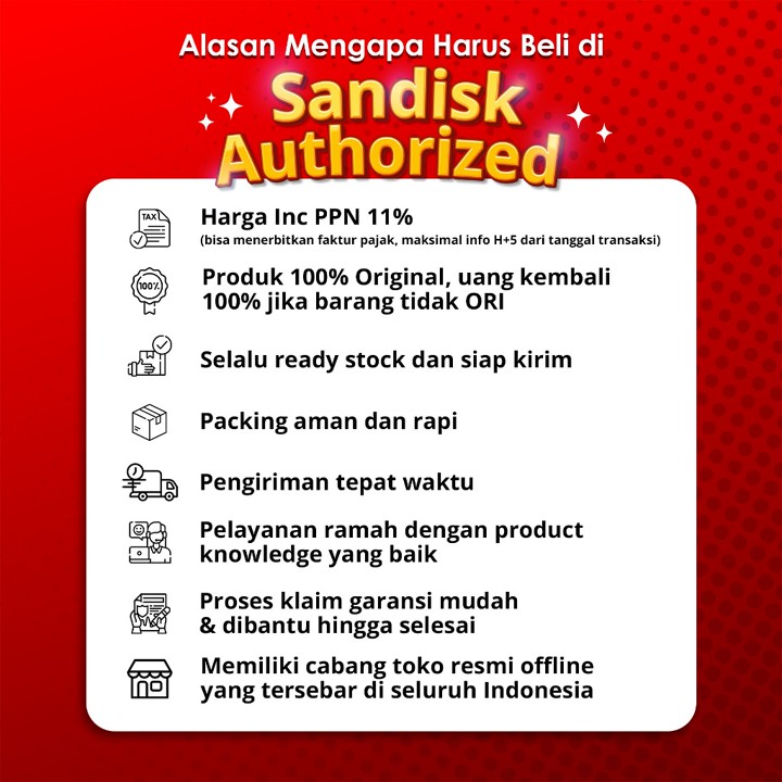 Dari sisi konstruksi, meskipun detail material tidak disebutkan secara eksplisit, penekanan pada status 100% Original dan garansi resmi mengindikasikan penggunaan komponen berkualitas dari SanDisk. Adanya penjaminan klaim garansi yang mudah dibantu hingga selesai oleh penjual menjadi nilai tambah signifikan, karena ini menunjukkan dukungan purna jual yang kuat, bukan hanya jaminan merek semata.