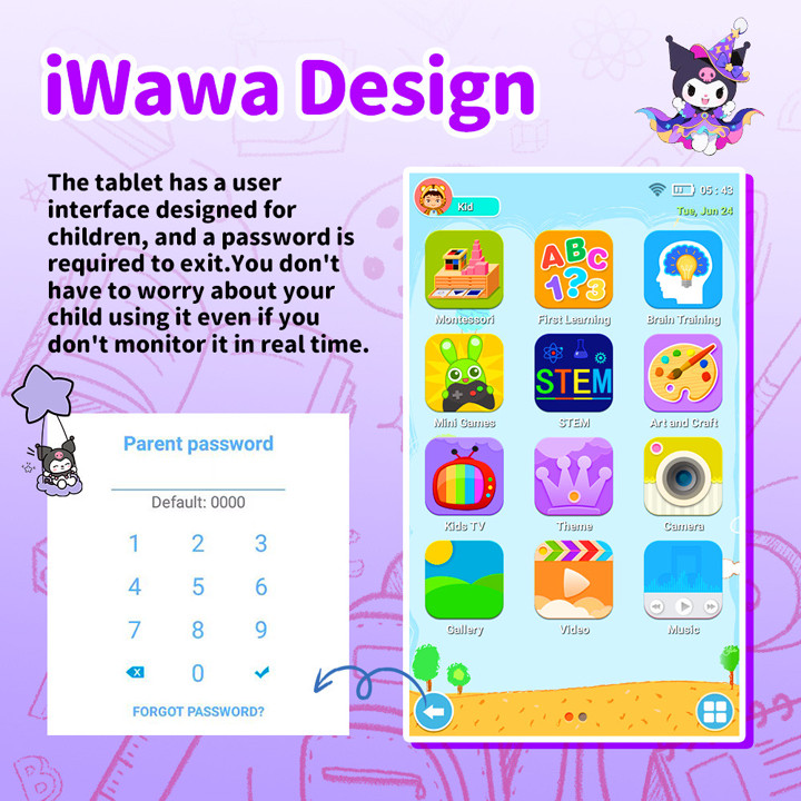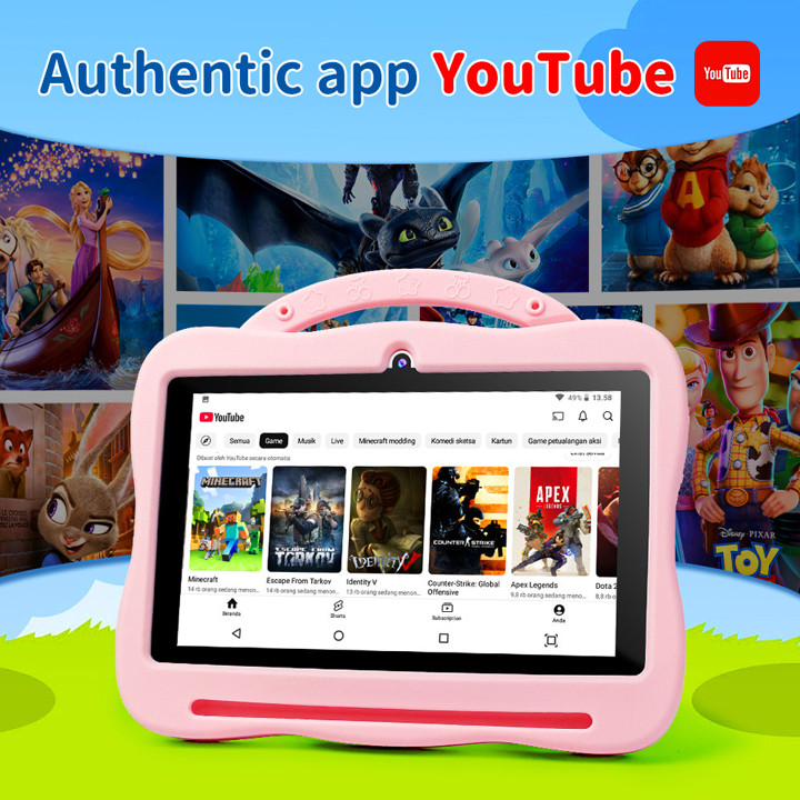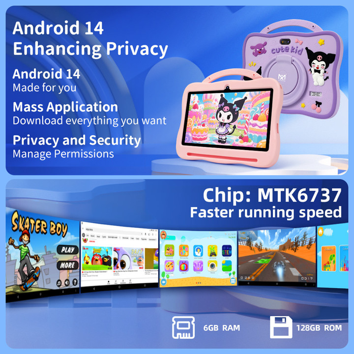 Tablet Android anak 7.1 inch dengan spesifikasi 6GB RAM dan 128GB penyimpanan, dilengkapi desain karakter lucu seperti Kuromi yang menarik minat anak-anak. Produk ini menawarkan fitur lengkap seperti kamera ganda, WiFi, dan akses ke Play Store dengan harga yang sangat terjangkau di kisaran Rp 667.000.
