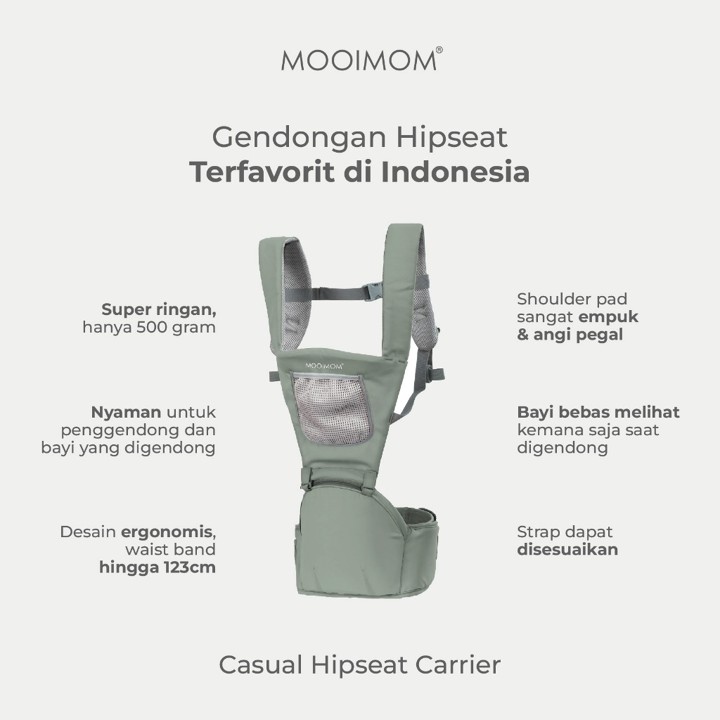 Suka sekali warnanya yg sleek, light grey tp mengarah ke hijau tosca juga. Hipseatnya useful banget buat anak saya yg belum bisa duduk tegak. Mangku depan pake hipseatnya doang, gak pegel lagi kalo mangku depan. Thanks Mooimom. Sukses selalu.
