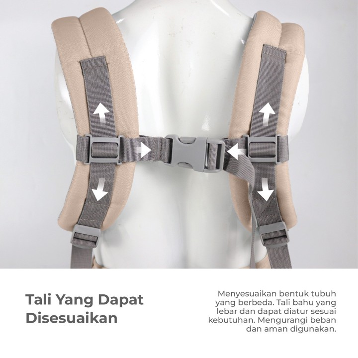 Material utama yang digunakan adalah Polyester 100%, dikombinasikan dengan bahan katun pada beberapa bagian, memastikan kenyamanan pemakaian jangka panjang. Konstruksi tali bahu yang dilaporkan empuk dan dapat diatur sangat krusial karena dirancang untuk mengurangi beban pada bahu penggendong. Meskipun ada perbedaan spesifikasi bahan (deskripsi menyebut Katun, spesifikasi menyebut Polyester), fokus utama adalah pada desain yang mendukung postur alami bayi.
