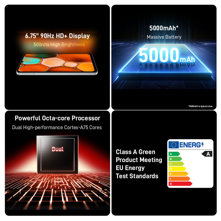 Produk ini menonjolkan spesifikasi layar HD+ 90Hz yang mulus untuk hiburan dan prosesor Octa-core 1.6GHz yang cukup responsif untuk aplikasi ringan. Fitur Kamera AI 13MP dan Face Unlock menambah nilai fungsionalitas, sementara dukungan Fast Charging memastikan daya tahan baterai 5000mAh dapat dimanfaatkan secara optimal sepanjang hari.