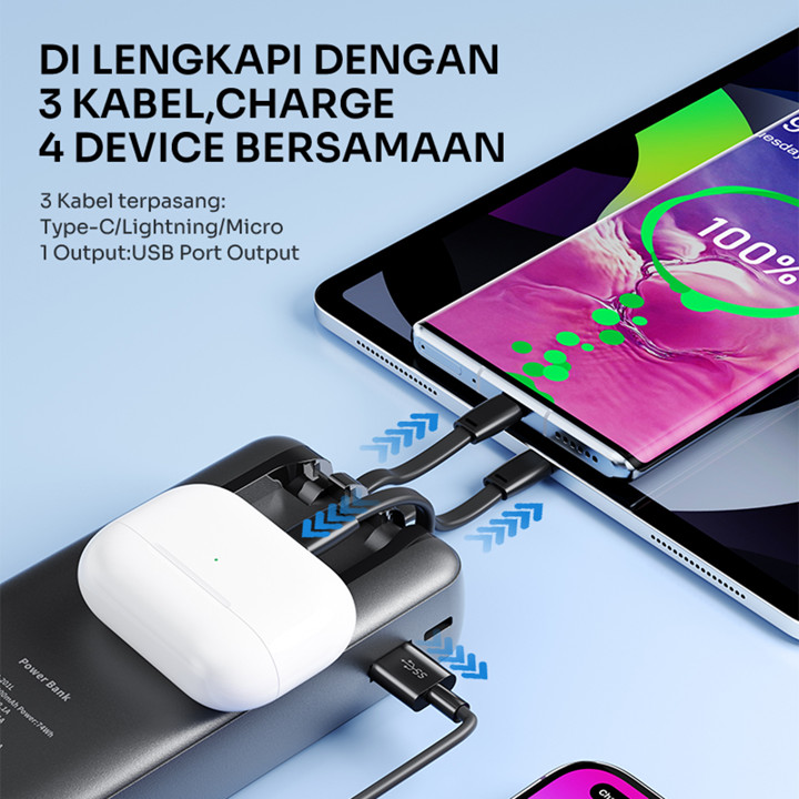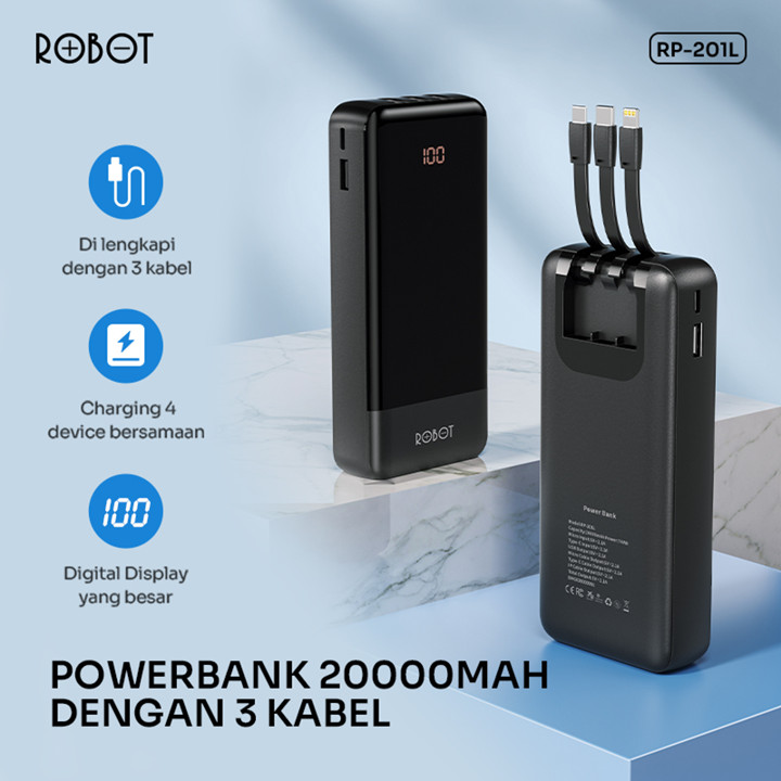 Powerbank ROBOT 20000mAh RP-201L ini adalah solusi pengisian daya portabel premium dengan kapasitas besar dan fitur multifungsi berupa 3 kabel charger sekaligus. Keunggulan utamanya adalah kompatibilitas universal untuk berbagai perangkat dan klaim keamanan tinggi, menjadikannya pilihan andal untuk kebutuhan daya darurat sehari-hari.