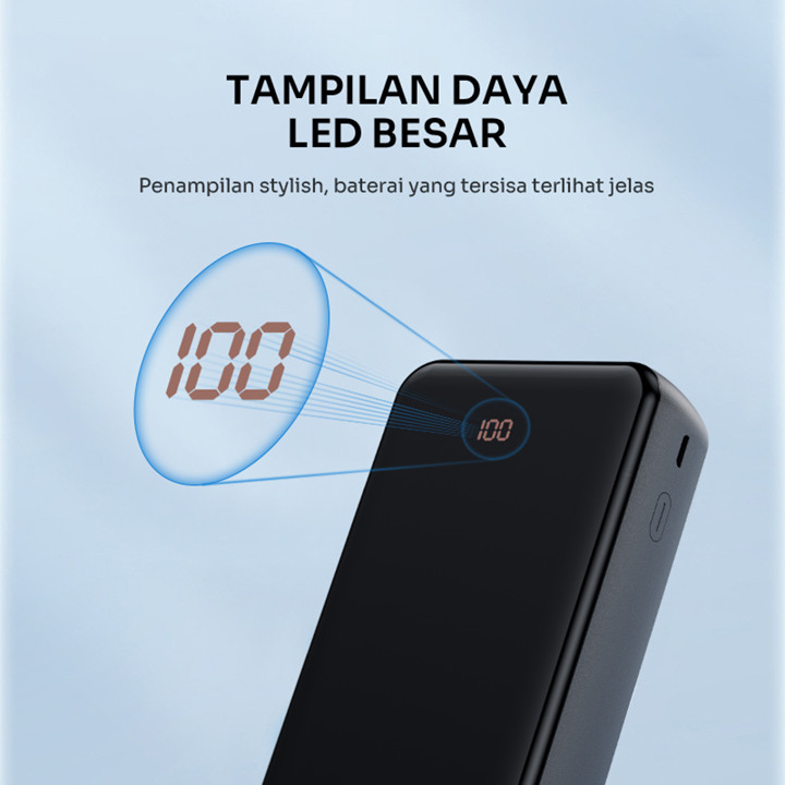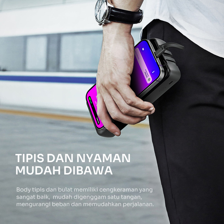Desain produk ini menonjolkan aspek kepraktisan dan portabilitas, ditandai dengan klaim lightweight and portable serta kemampuan dibawa ke pesawat. Fitur visualisasi sisa baterai yang jelas dan desain yang stylish menjadikannya menarik secara estetika. Keberadaan 3 kabel charger terintegrasi (Type-C, Lightning, Micro) sangat meningkatkan nilai desain dengan mengurangi kebutuhan membawa banyak aksesoris.