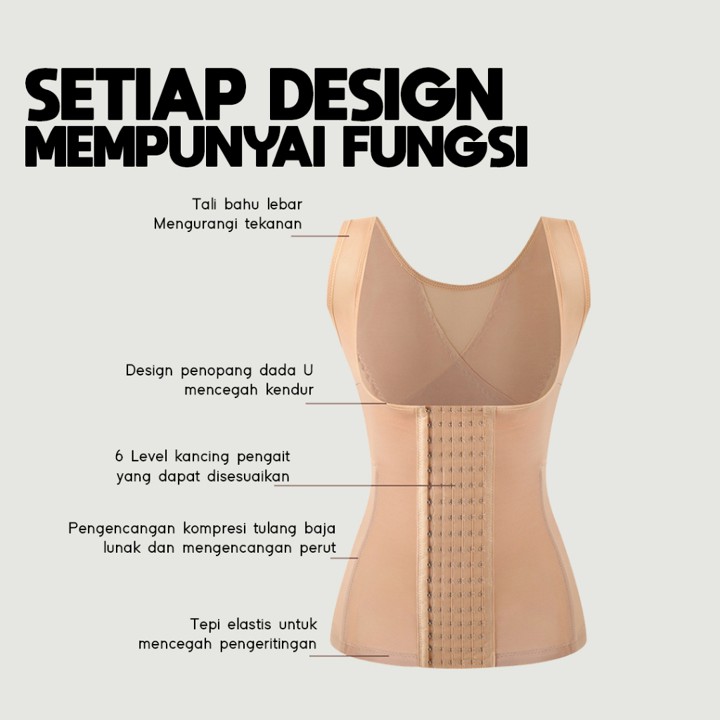 Produk ini menonjol dengan fitur konstruksi yang solid, dilengkapi dengan 4 tulang internal yang halus dan 6 pengait di bagian depan. Fitur ini memberikan dukungan struktural yang signifikan untuk menyangga tubuh, mengencangkan area perut buncit, serta mencegah pakaian luar menjadi melambir, menjadikannya solusi efektif untuk memperbaiki postur dan bentuk badan secara instan.