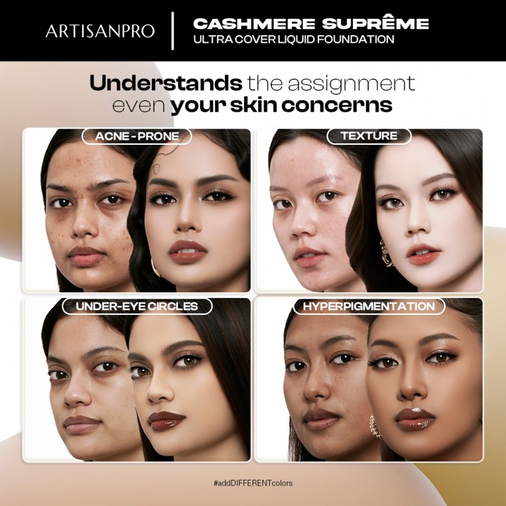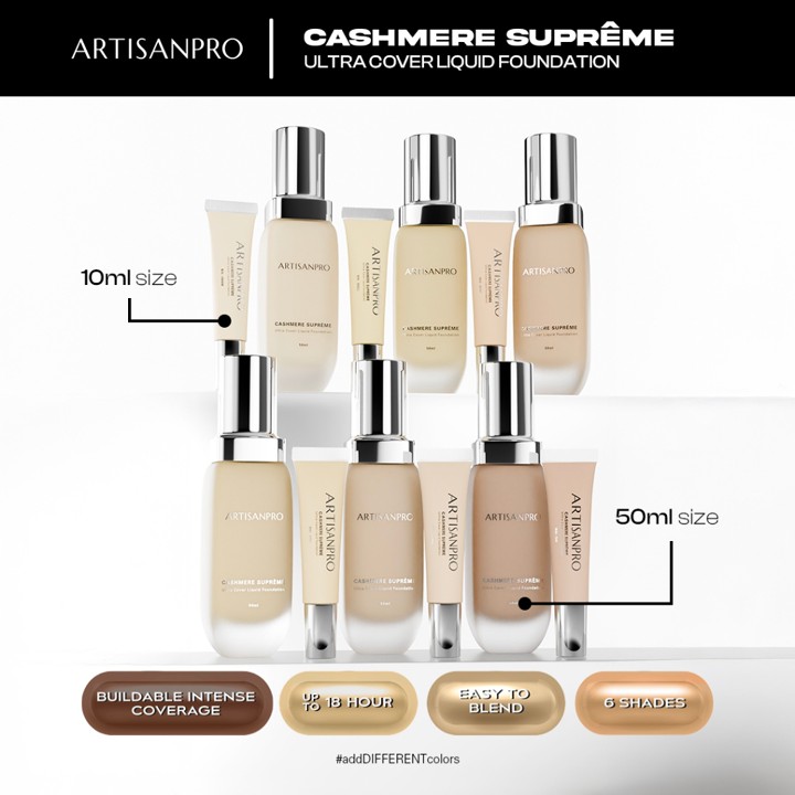 ARTISANPRO CASHMERE SUPREME menawarkan foundation liquid dengan coverage medium hingga tinggi yang tahan lama hingga 18 jam, diformulasikan khusus untuk kebutuhan makeup artist profesional. Dengan harga terjangkau di bawah Rp 100.000, produk ini memberikan performa setara dengan merek premium berkat teknologi Advanced Skin Complex yang membuat aplikasi terasa ringan dan fleksibel. Tersedia dalam varian ukuran 10ml dan 50ml, produk ini menjadi solusi ideal bagi yang mencari foundation tahan lama tanpa mengorbankan kenyamanan kulit.
