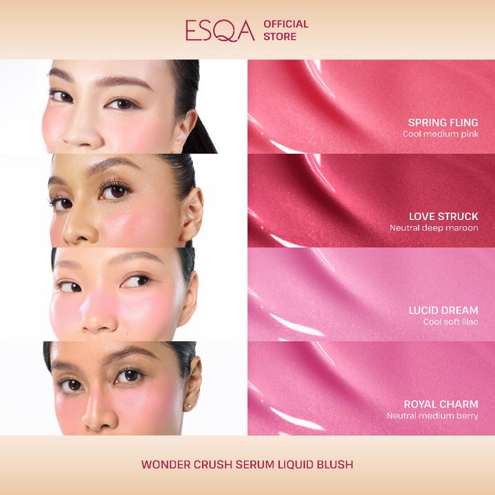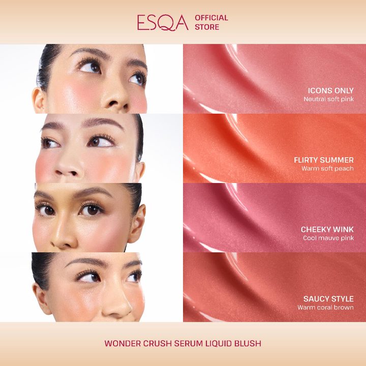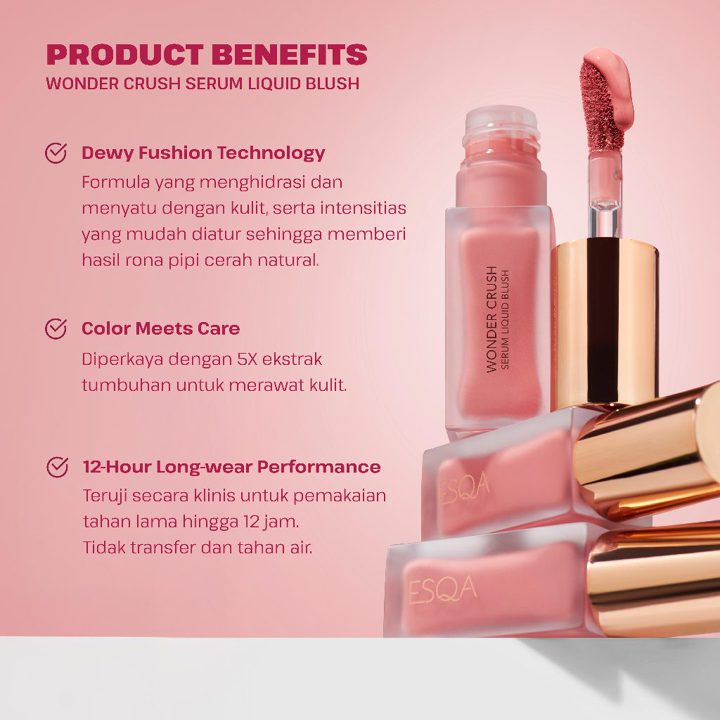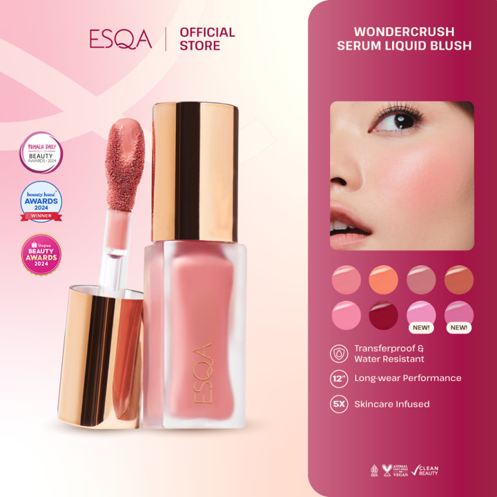 ESQA Wonder Crush Serum Liquid Blush adalah blush on cair organik asal Indonesia yang menawarkan hasil glowy alami dengan teknologi Dewy Fusion. Dengan harga terjangkau dan rating tinggi, produk ini cocok untuk semua jenis kulit yang menginginkan sentuhan warna tahan lama dan hydrating. Tersedia dalam kemasan misterius yang menambah nilai eksklusivitas bagi kolektor kosmetik.