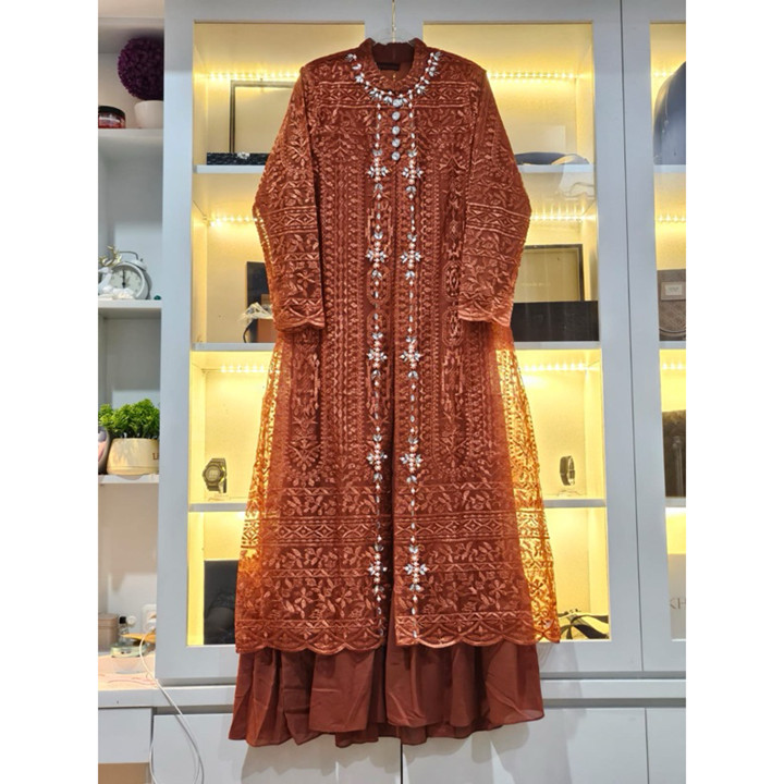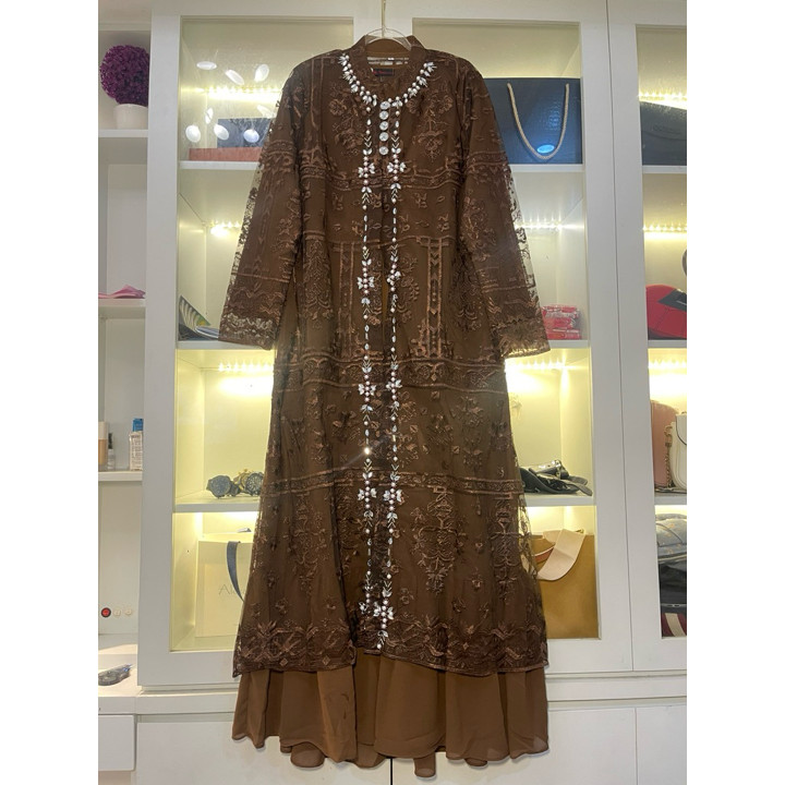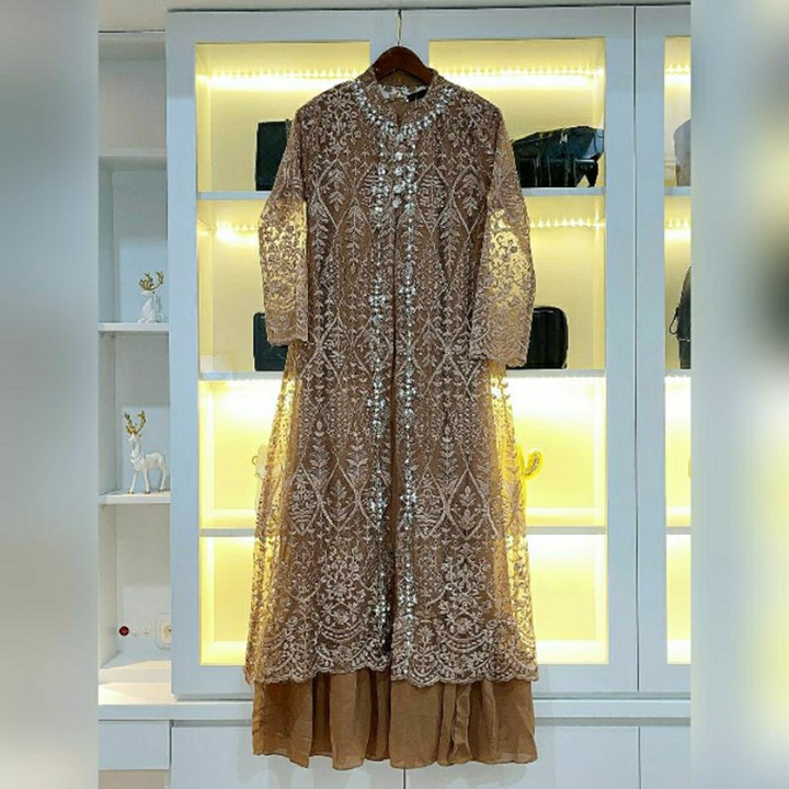 Secara material, gamis ini menggunakan kombinasi bahan Matt Tille Sapto dan Dalaman Ceruty Puring yang memberikan tekstur premium namun tetap nyaman dikenakan. Lapisan Matt Tille memberikan kesan mewah dan jatuh yang elegan, sementara dalaman ceruty puring memastikan kenyamanan ekstra di area yang bersentuhan langsung dengan kulit. Konstruksi ukuran jumbo yang tersedia dengan rentang lingkar dada hingga 116 cm menunjukkan perhatian khusus terhadap inklusivitas ukuran, memastikan kenyamanan bagi berbagai tipe tubuh tanpa mengorbankan estetika.