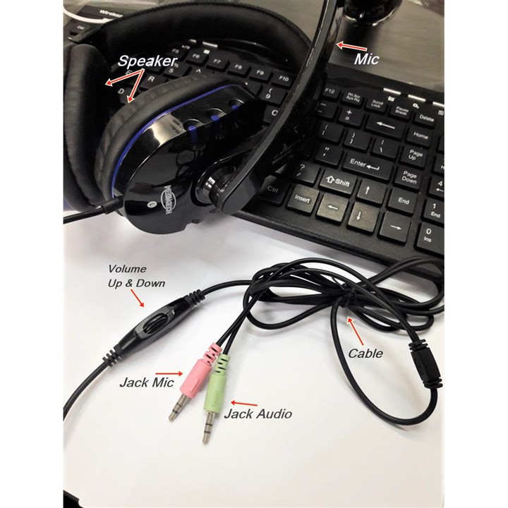 Produk ini menonjolkan fitur utama sebagai headset gaming lengkap dengan mikrofon, menjadikannya ideal untuk komunikasi dalam game online. Selain itu, spesifikasi audio menunjukkan dukungan untuk Noise Isolating dan kontrol volume, meningkatkan pengalaman mendengarkan secara keseluruhan. Kehadiran kabel splitter sangat krusial karena memungkinkan pengguna menghubungkan output audio (jack hijau) dan mikrofon (jack pink) secara bersamaan ke perangkat dengan port tunggal.