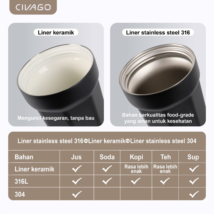 Produk ini dibangun menggunakan bahan stainless steel 304 berkualitas yang dikenal tahan korosi dan aman untuk kontak makanan, dilapisi dengan liner keramik yang berfungsi sebagai penghalang panas dan mencegah rasa logam meresap ke dalam minuman. Konstruksi termos vakum pada badan mug memastikan isolasi suhu yang efektif, mampu menahan minuman panas tetap hangat dan dingin tetap sejuk dalam waktu lama, sementara fitur anti bocor dan tahan panas memberikan keamanan tambahan bagi pengguna di berbagai aktivitas.