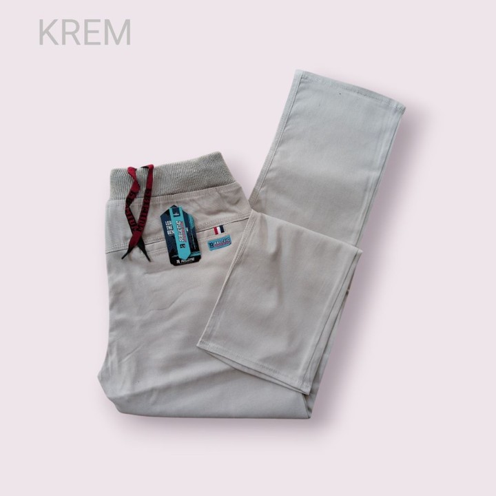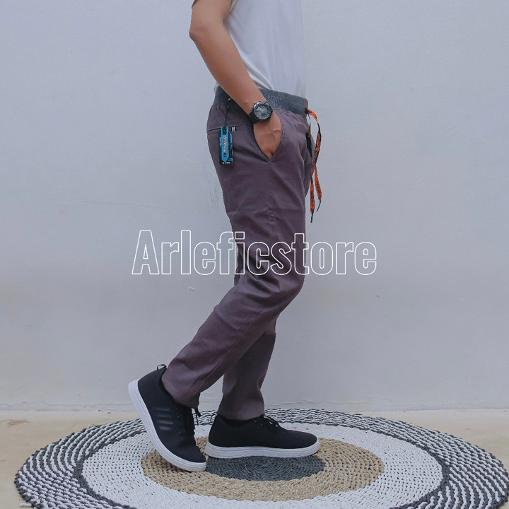 Material utama yang digunakan adalah katun twill stretch, sebuah kombinasi tekstil yang secara teknis menawarkan ketahanan serat kapas dengan elastisitas poliester. Tekstur kain yang halus dan sifatnya yang melar secara alami membuat celana ini sangat nyaman dipakai seharian, mengurangi ketegangan di pinggang dan paha. Kandungan katun menjamin pernapasan yang baik sehingga kaki tetap sejuk, sementara komponen stretch memastikan celana tetap pas meskipun saat duduk atau bergerak aktif.