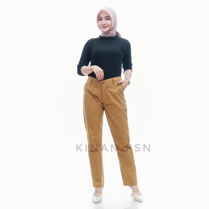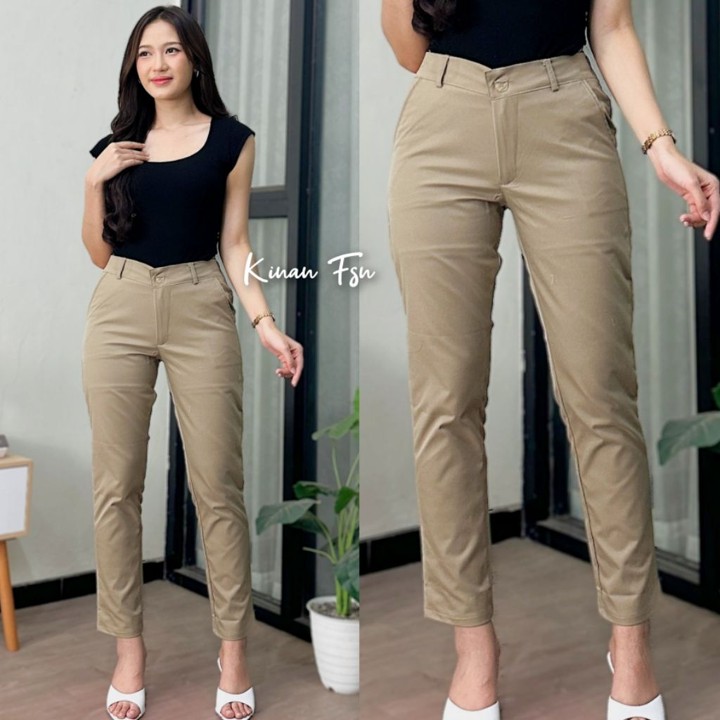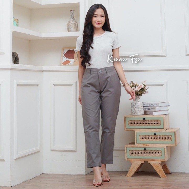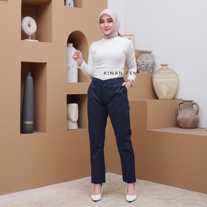 Desain celana ini mengusung gaya minimalis dan basic dengan motif polos yang serbaguna, mampu dipadukan dengan atasan formal maupun kasual. Pilihan ukuran yang tersedia sangat luas, mulai dari ukuran L hingga XXXL, dengan rentang lingkar pinggang mencapai 100 cm, menjadikannya solusi ideal bagi wanita dengan postur tubuh besar. Gaya potongan reguler dengan panjang 95 cm dan tinggi pinggang mid-waist menciptakan siluet yang rapi, mematuhi standar formal kantor sambil tetap mempertahankan kenyamanan sehari-hari.