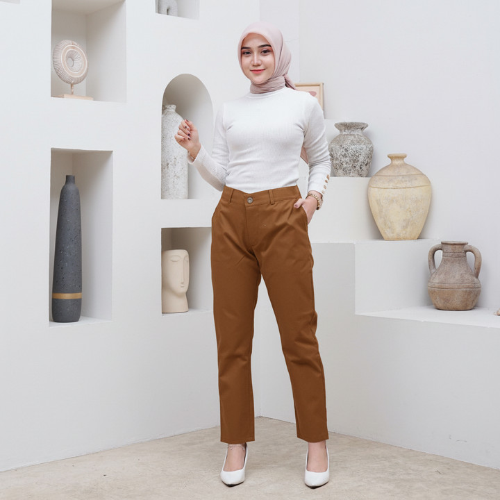 Produk ini dibuat dari bahan katun semi-stretch yang memiliki ketebalan optimal, memastikan celana tidak menerawang saat dipakai di bawah pakaian dalam berwarna terang. Tekstur kain yang lembut namun cukup padat memberikan kenyamanan ekstra, dengan kemampuan melar sekitar 2 cm yang membantu pergerakan tubuh tanpa longgar. Konstruksinya diperkuat dengan penambahan karet di bagian belakang pinggang, sebuah detail teknis yang signifikan untuk memastikan kepasan pada berbagai bentuk tubuh tanpa perlu ikat pinggang tambahan yang ketat.