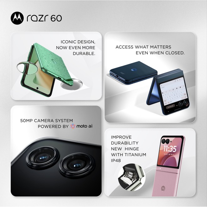 Motorola Razr 60 | 4500mAh 30Wwired/15W WLC - 32MP Selfie - 50MP RearCam OIS - 13MP UW/Macro - Moto AI - 3.6”Ext/6.9”Int Display - FHD+ LTPO 1-120Hz - Dolby Stereo - Titanium Hinge - IP48 - GGVictus