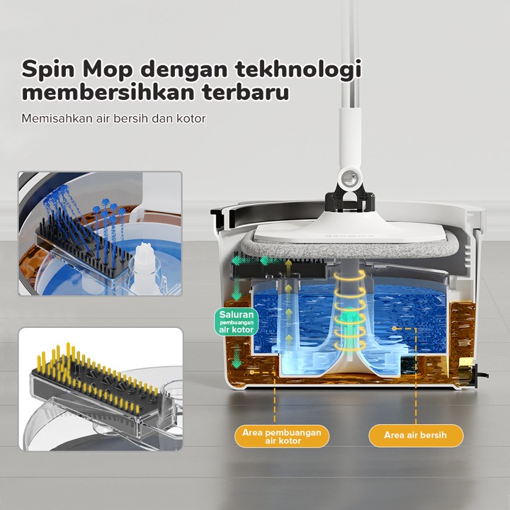 Fitur unggulan utama dari produk ini adalah sistem Dual Bucket yang mampu memisahkan air kotor dan air bersih secara otomatis, meniru efisiensi mesin cuci. Mekanisme putar (spin) dan perasan otomatis memastikan kain pel selalu dalam kondisi optimal untuk membersihkan kotoran secara tuntas. Keunggulan lain adalah desain yang diklaim inovatif dengan kemampuan berputar 360 derajat, menjanjikan cakupan pembersihan yang menyeluruh.
