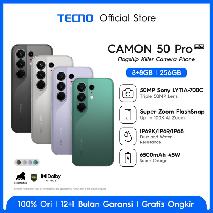 Tecno Camon 50 Pro 5G menawarkan paket lengkap dengan kamera 50MP Sony LYT-700C, lensa telephoto 3x, dan baterai raksasa 6500mAh dalam desain tahan air IP69K. Dilengkapi layar AMOLED 144Hz dan chipset Dimensity 7400 Ultimate, ponsel ini menargetkan pengguna yang mengutamakan fotografi dan daya tahan baterai.