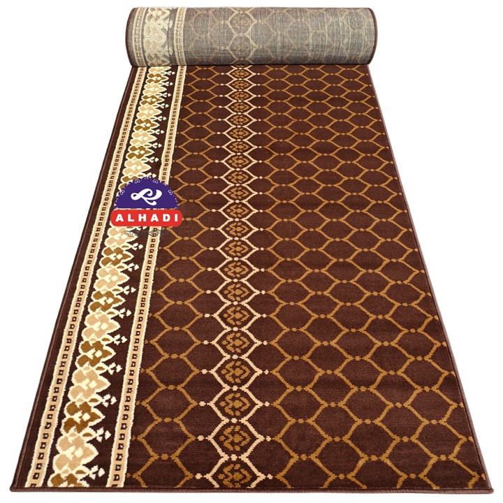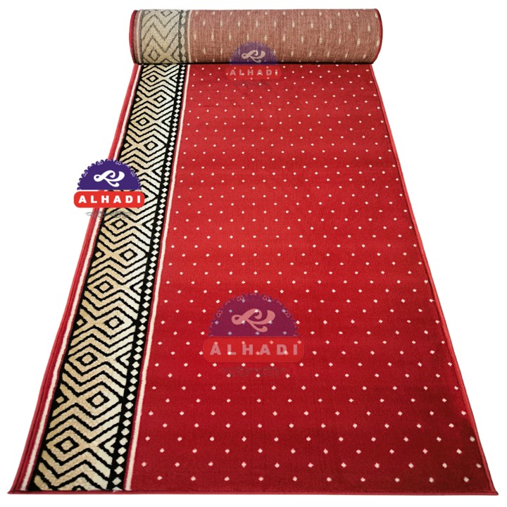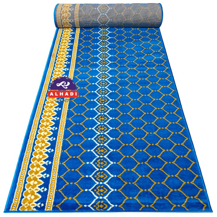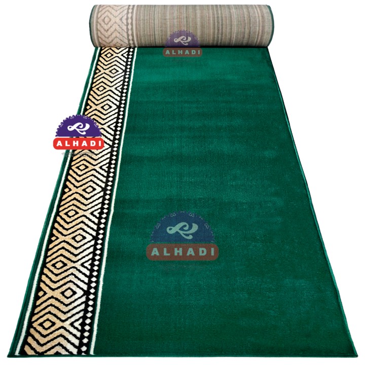 Bahan utama yang digunakan adalah Polypropylene Heatset dengan jenis benang BCF (Bulk Continuous Filament), yang dikenal tahan lama dan tidak mudah pudar. Konstruksinya dilengkapi alas bawah Woven yang mencegah karpet bergeser saat digunakan, serta fitur anti-bau dan anti-jamur yang sangat penting untuk menjaga kebersihan dan higienitas area sholat.