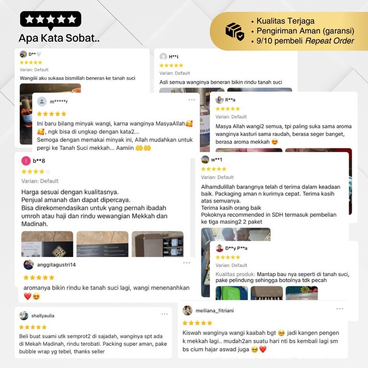 Pengemasan rapi dan sangat aman, double bubble wrap. Disolatip jg botolnya jadi mengurangi goncangan. Wangi nya pas, mudah2an segera ke makkah dan madinah biar bandingin langsung wangi nya sambil haji dan umroh. Aamiin.